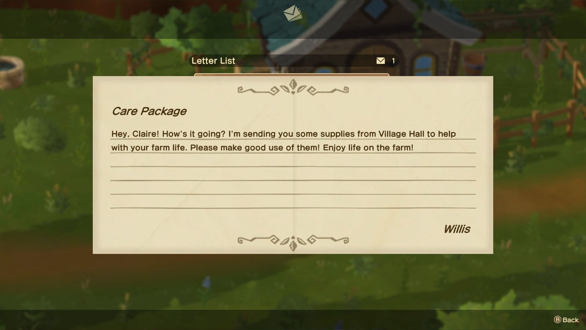 You’ll receive the HM HSH Welcome Care Package in your mailbox, sent by Willis – the father of a friend from your childhood in Harvest Moon: Home Sweet Home.