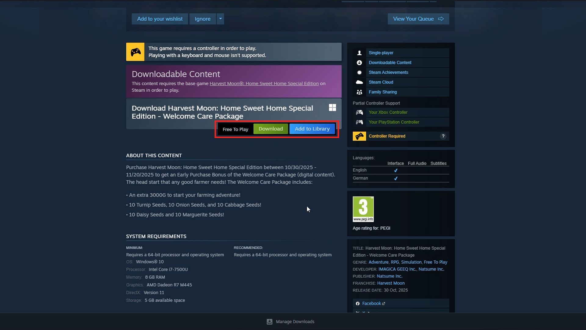 To get the Welcome Care Package in Harvest Moon: Home Sweet Home, you’ll need to locate and download the digital content. It’s installed much like any downloadable content or extra game add-on.