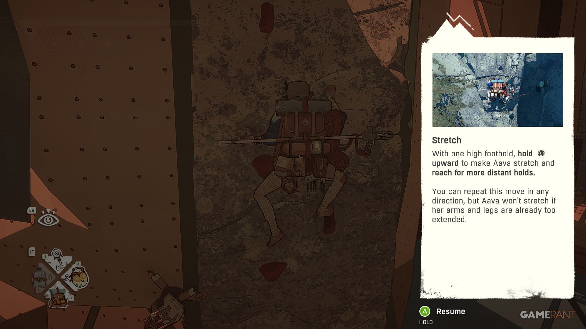 Players can give Aava extra grip by applying Chalk to her hands. Simply hold the right direction on the D-pad. This will make it easier for her to climb slippery surfaces for the next twelve handholds. Use Chalk strategically – it’s helpful, but don’t overuse it.
