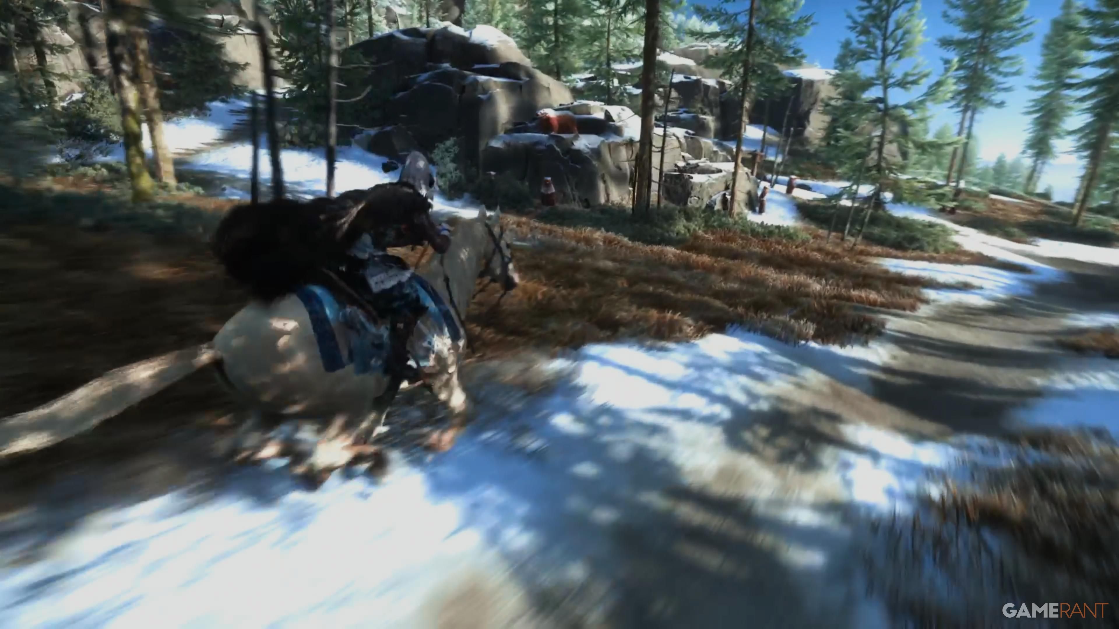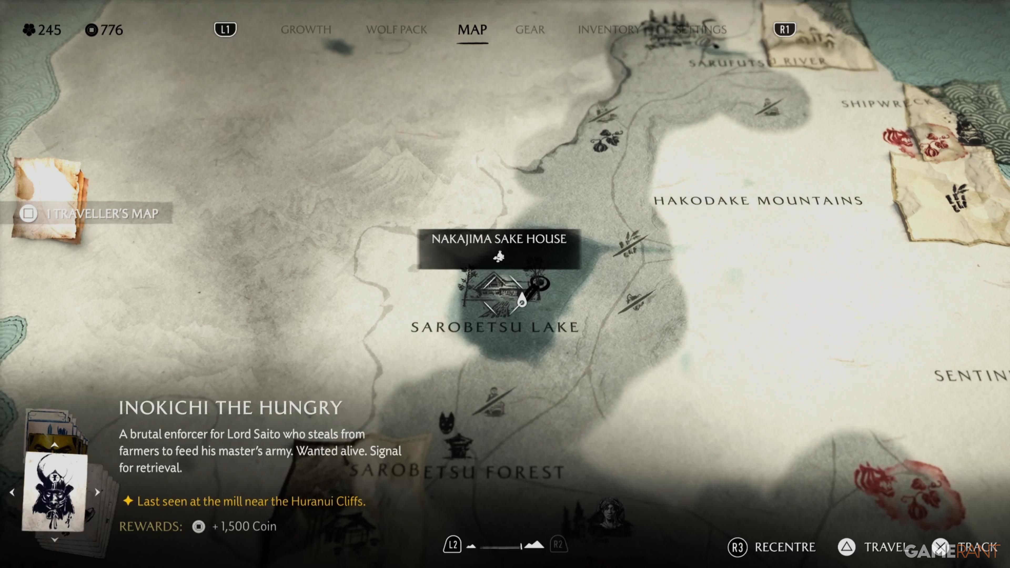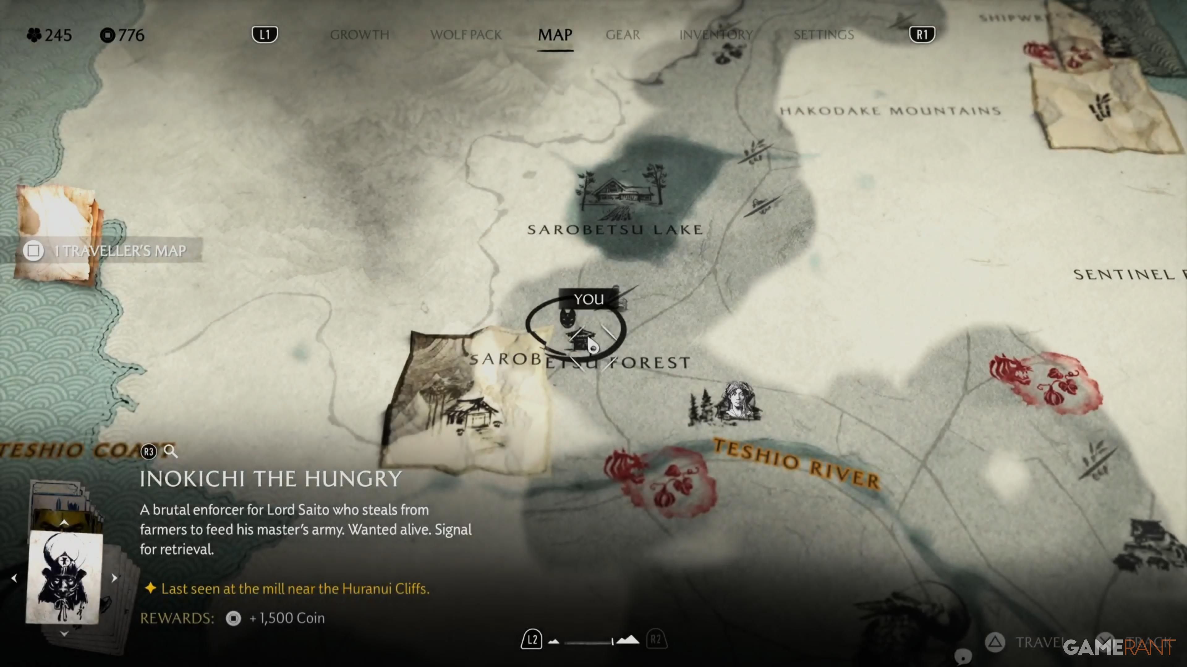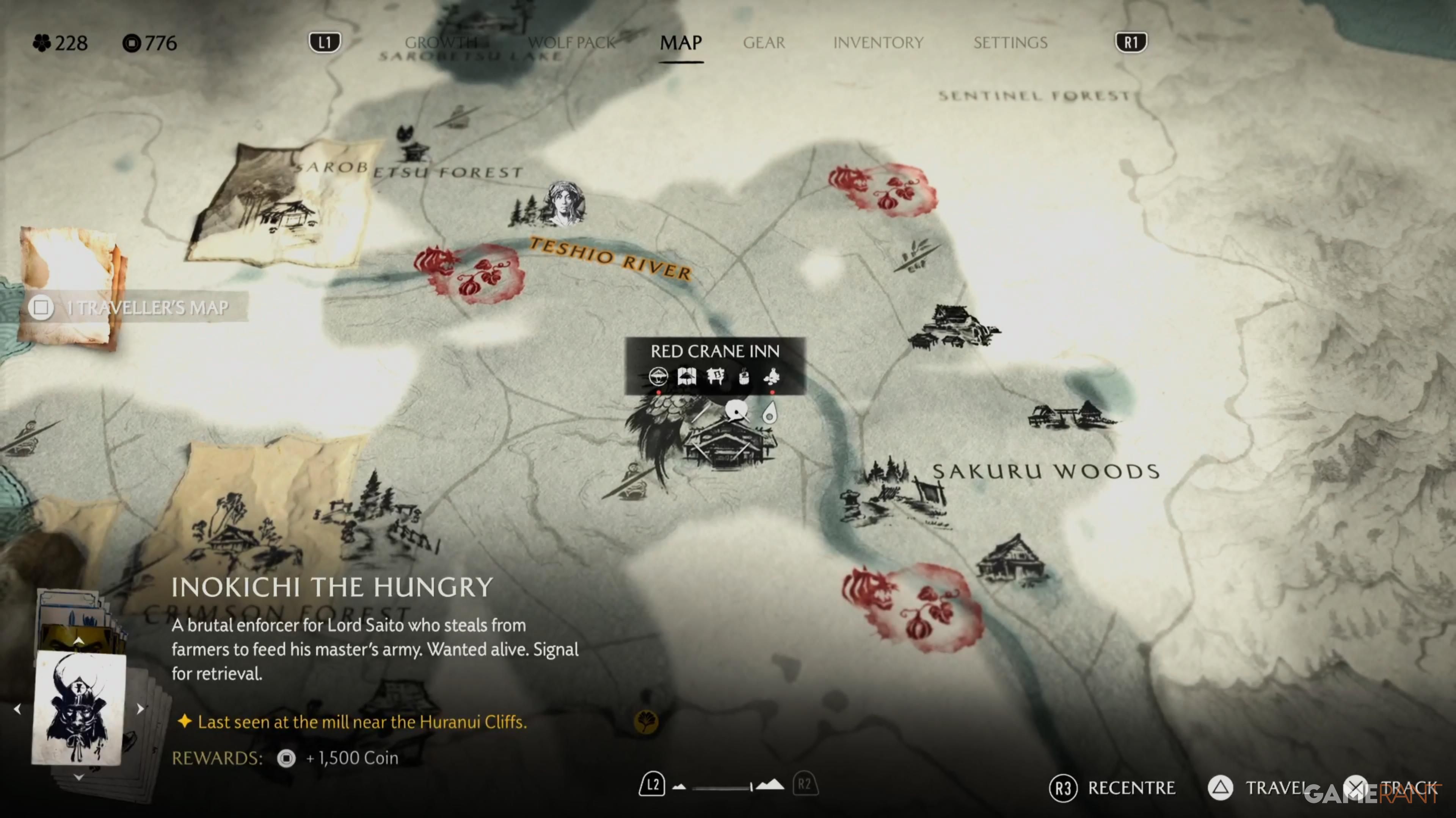 Because the Red Crane Inn is shown on your map and is where the story continues, head there first. You don’t have to go *inside* the Inn or begin the story segment right away. Just getting to the location unlocks it as a fast travel point, allowing you to travel to Owl Mountain from there. Be careful on your journey, as you’ll pass through areas where you might start to get cold and could even run into a bounty target.