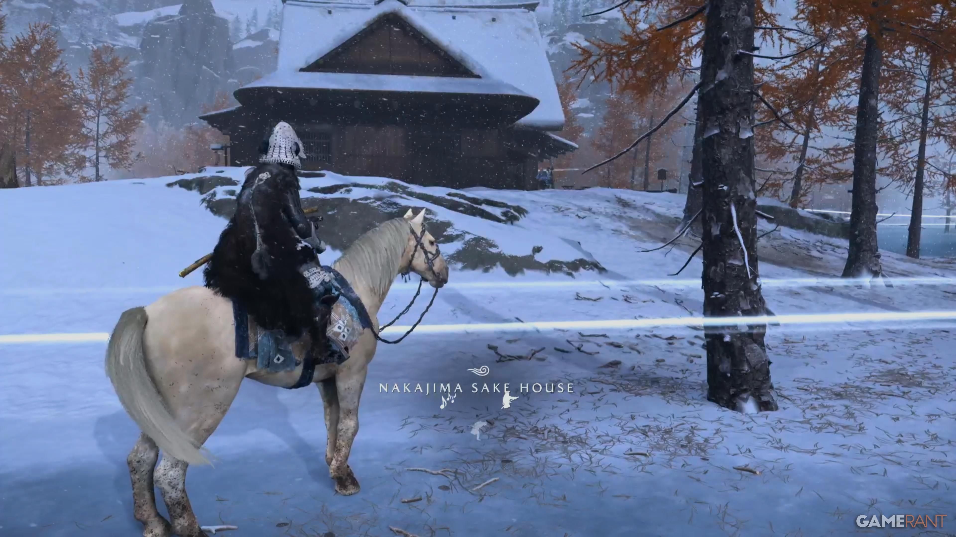 At the Sarobetsu Lake, it’s going to get very cold, but your goal is to reach the Nakajima Sake House. You can rest there before continuing. Begin riding north on your horse now, staying along the frozen lake and passing through the orange trees. You’ll soon see a road to follow. When the road forks near the wooden carvings, turn left and continue on that path towards the bridge in the distance.