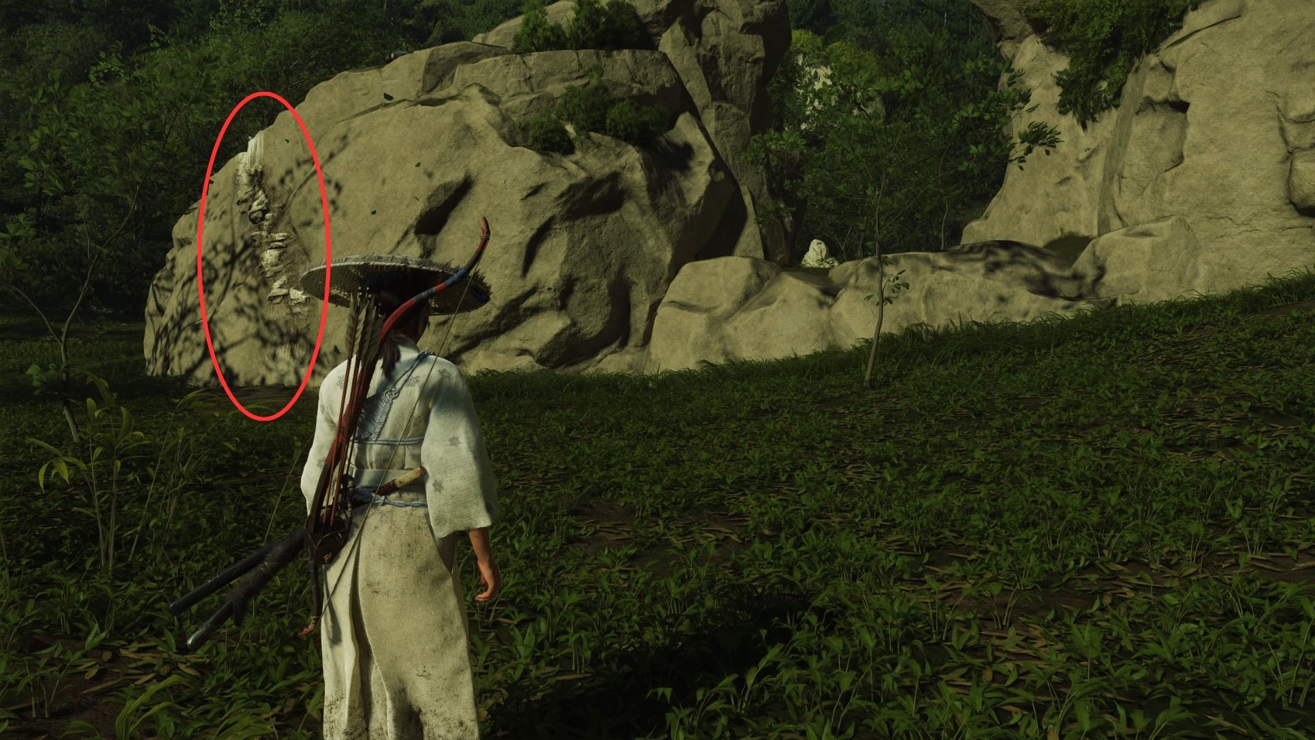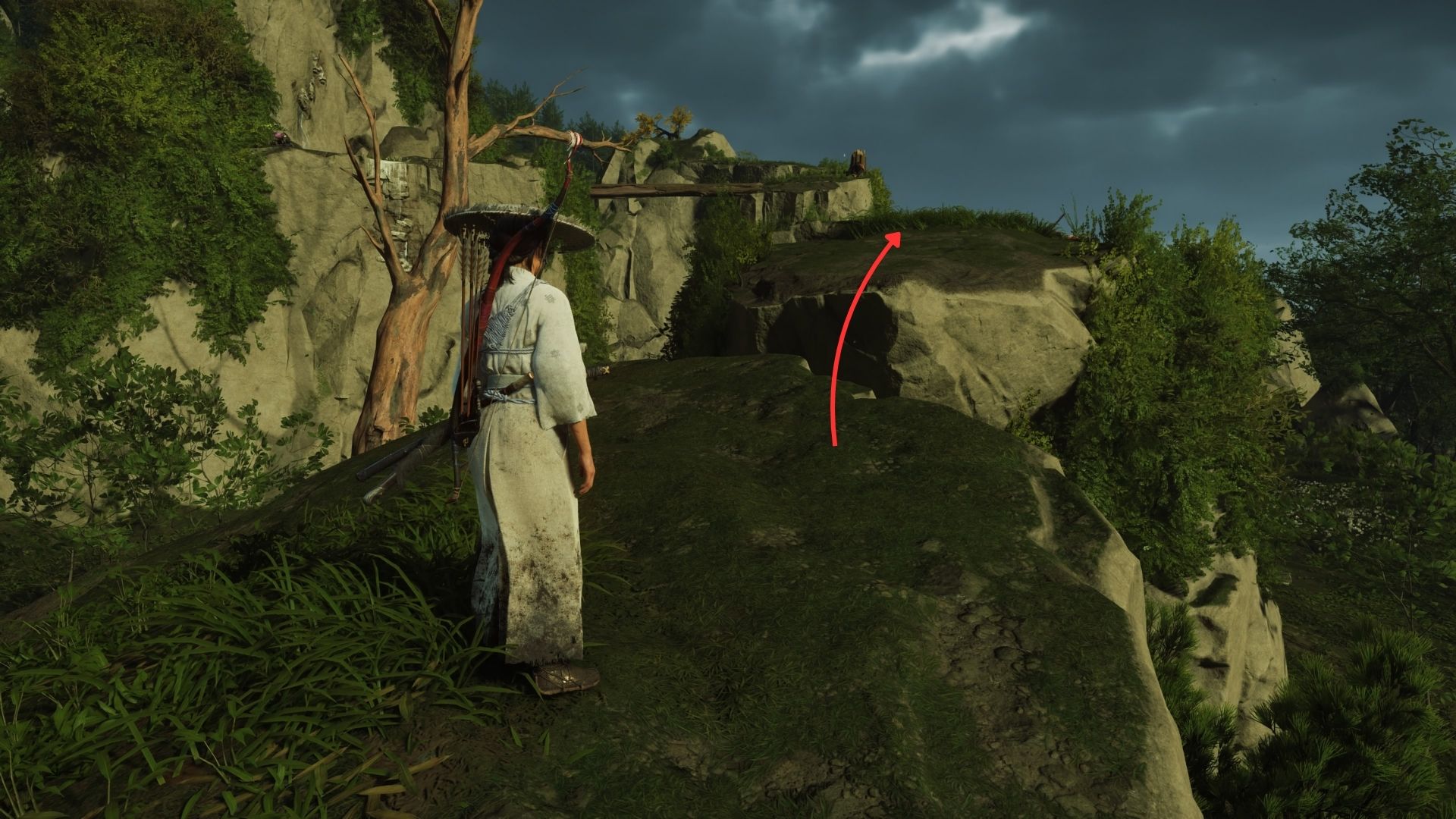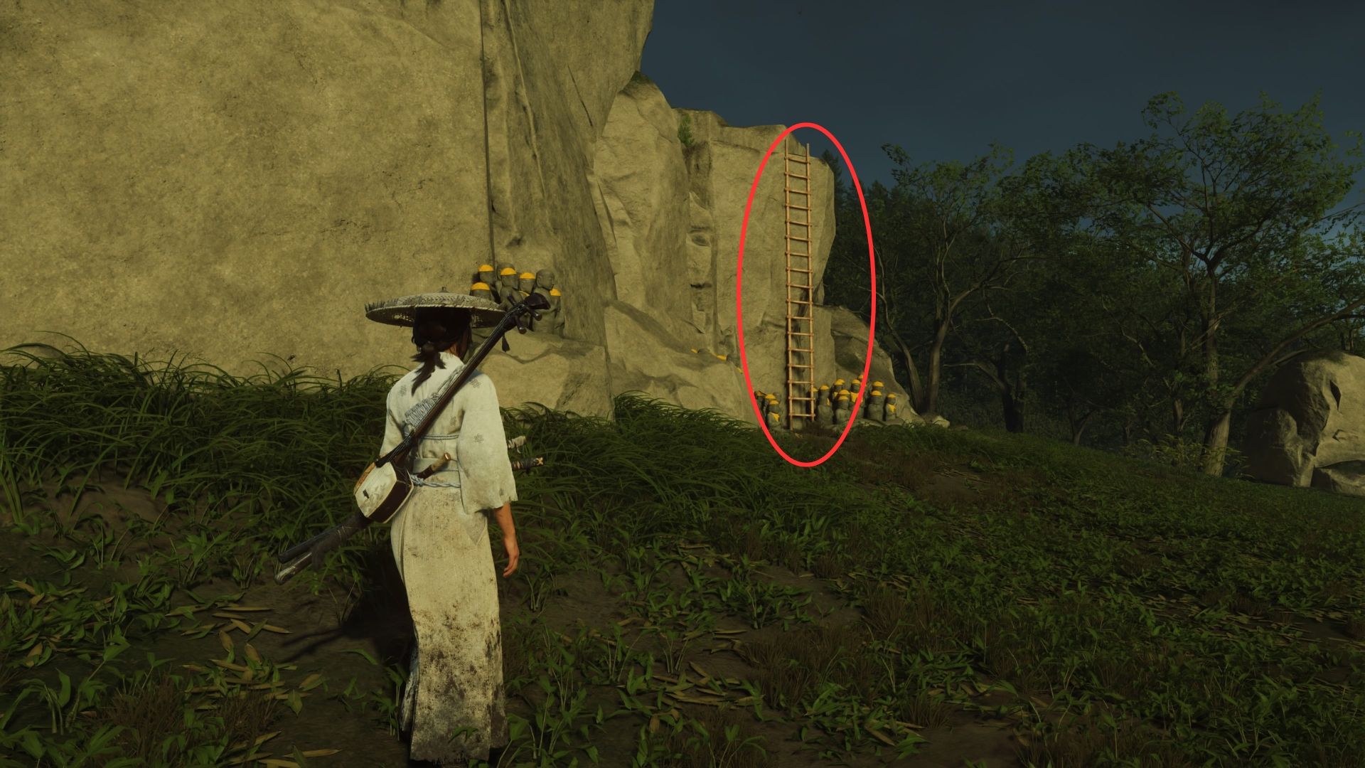 Go around the cliff where the ronin is resting, and you’ll find a wooden ladder near some stone statues with yellow heads. This ladder leads up to where he’s resting, but it’s only lowered after you’ve woken him with a song. Remember this!