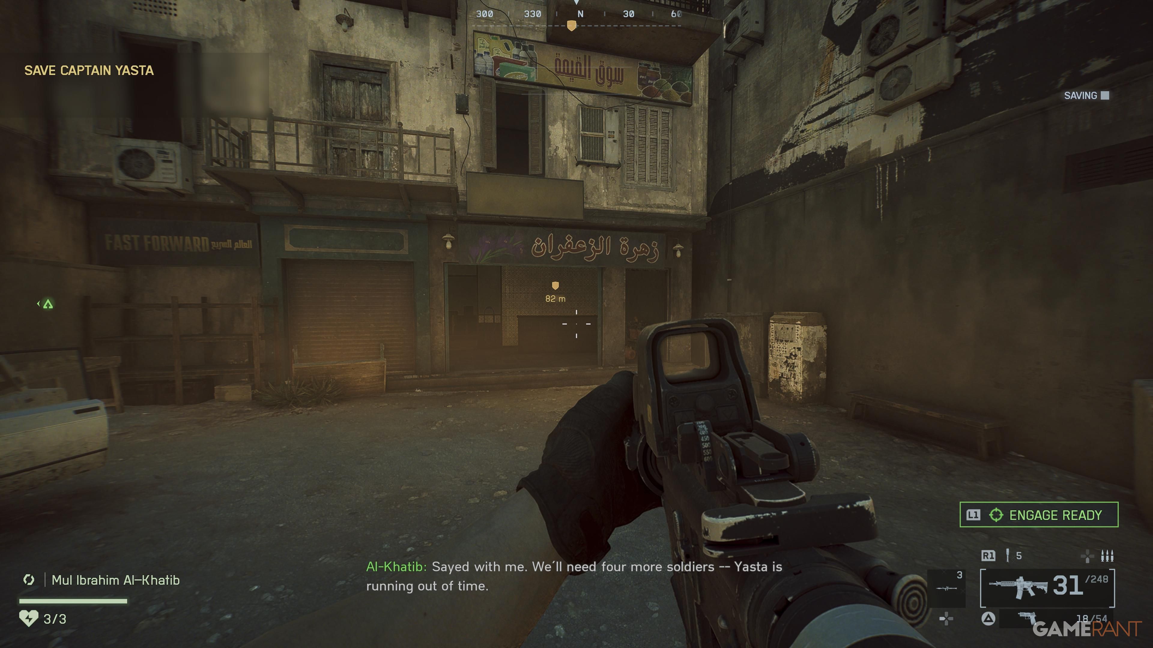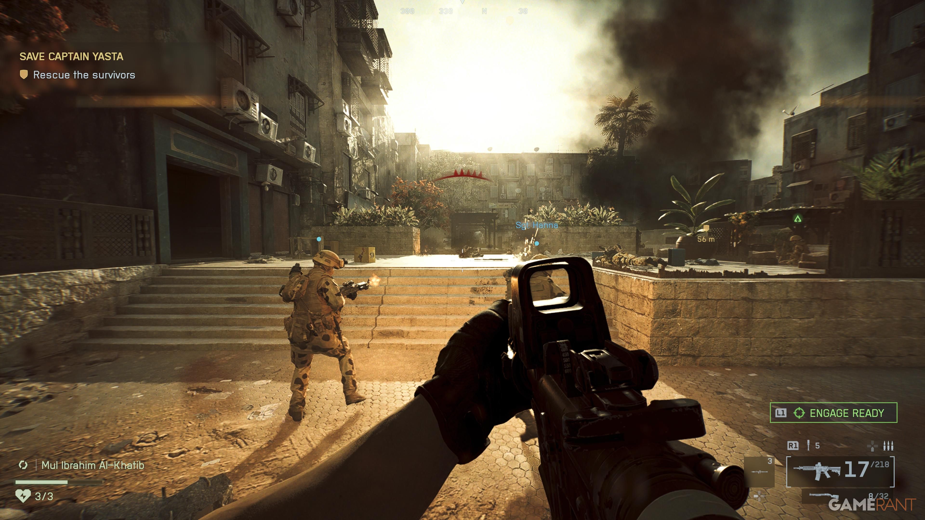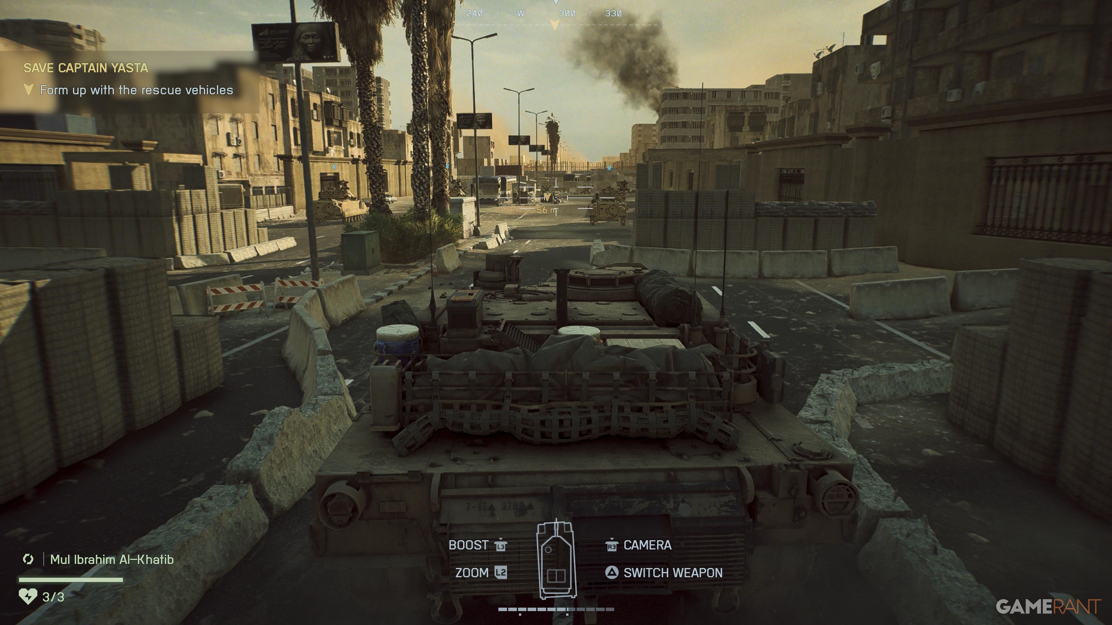 Continue with the mission, and you’ll encounter more tanks. A helicopter will be hit by a Javelin missile, requiring you to enter the town and rescue Captain Yasta. Navigate the narrow streets, being aware of enemies with RPGs, though you can choose to avoid them. Just keep following the on-screen markers, and you’ll eventually reach a point where you need to get out of the vehicle.
