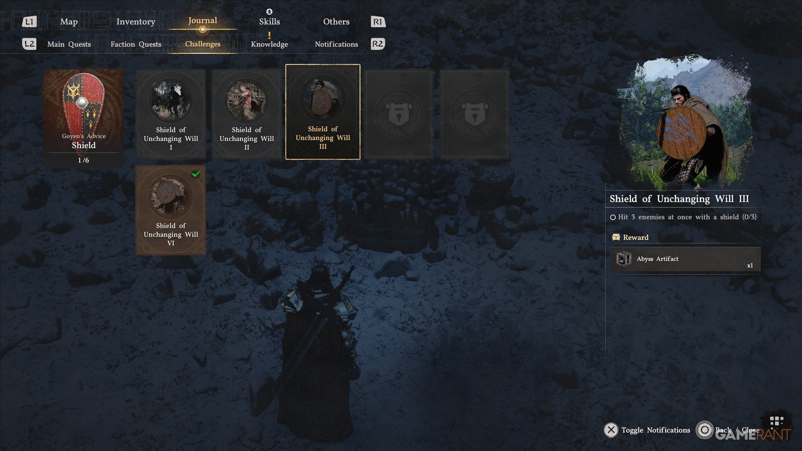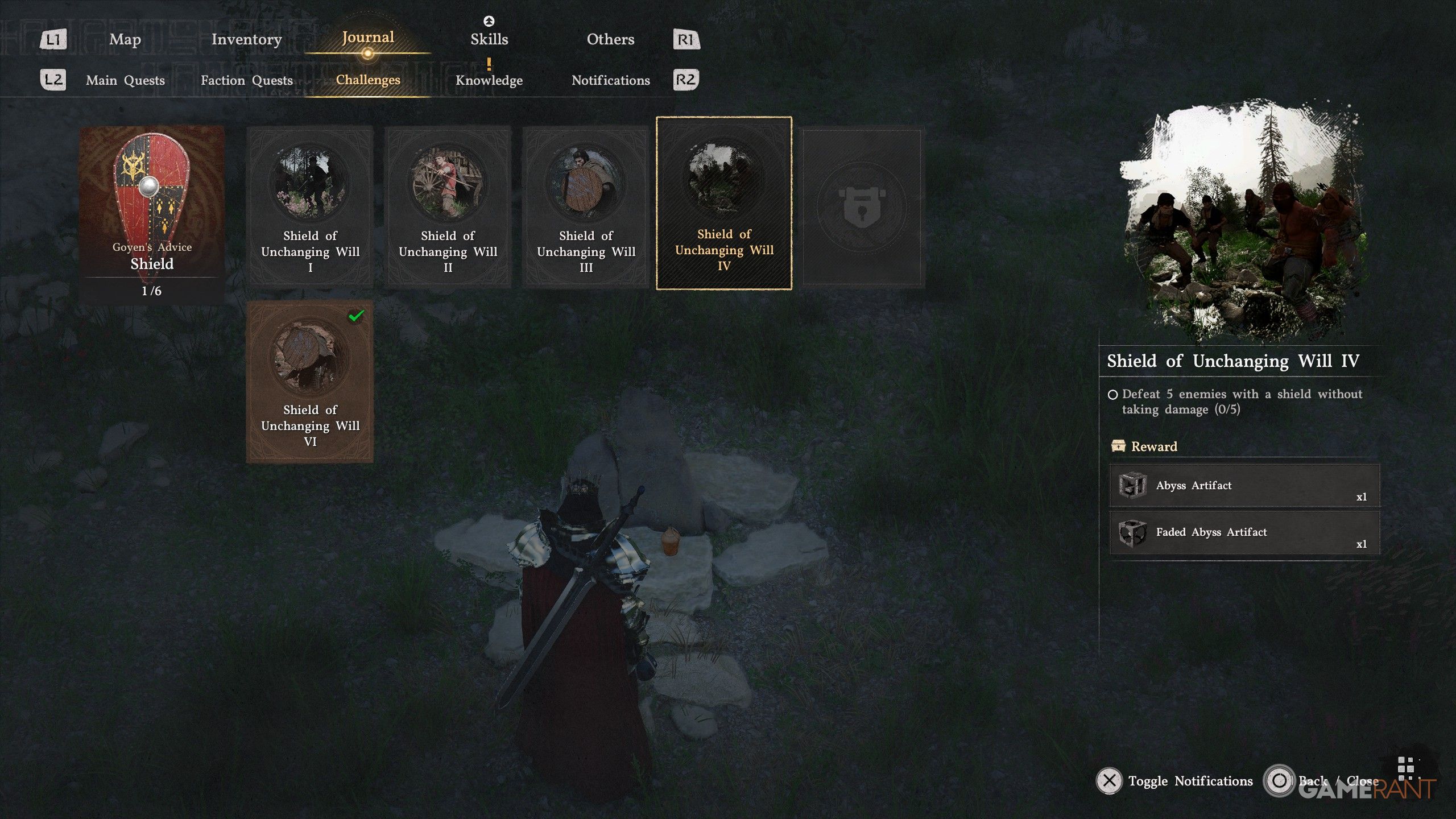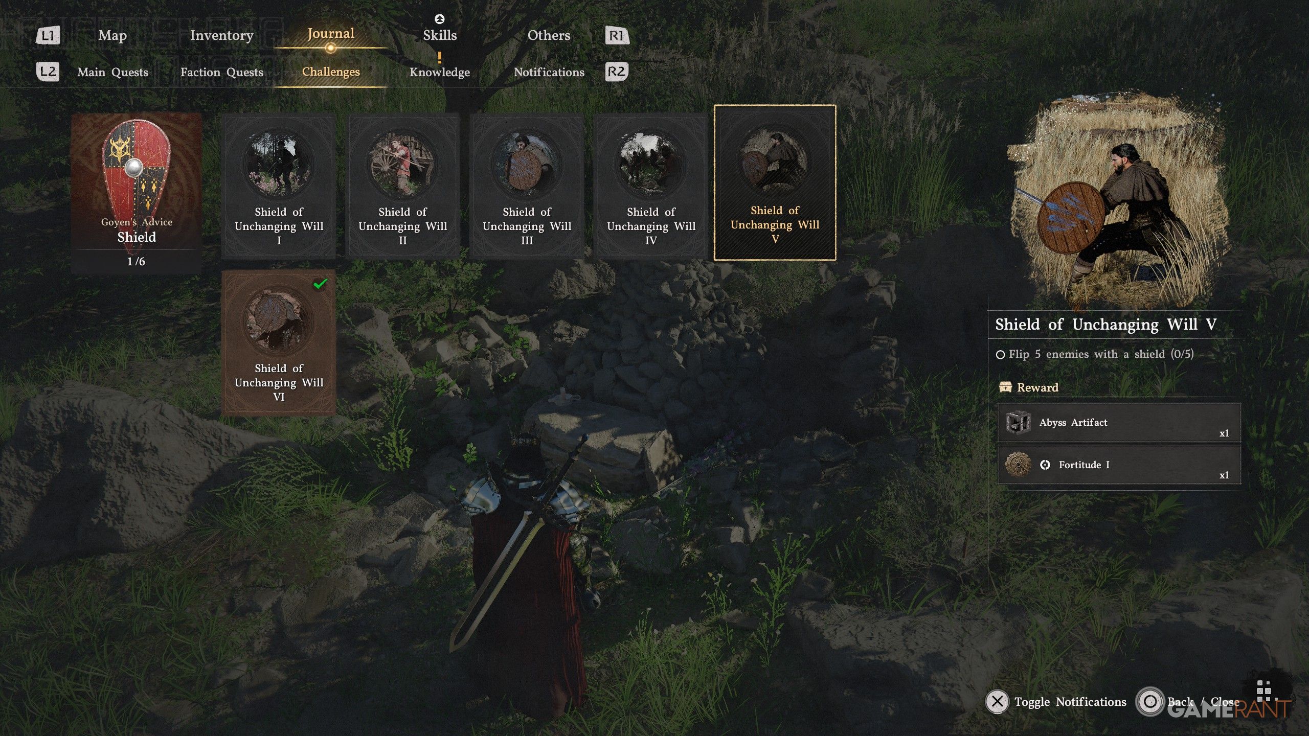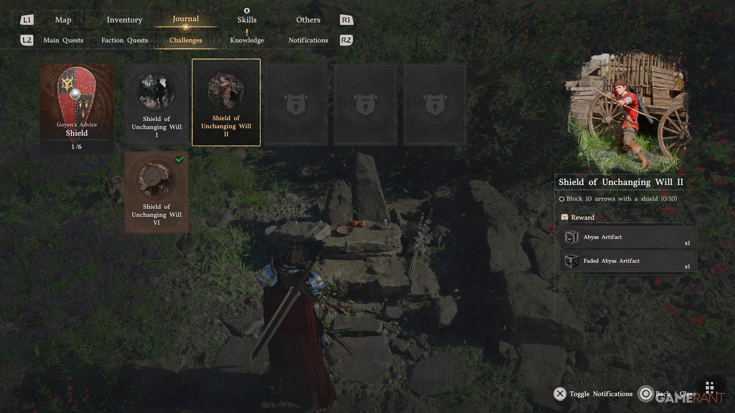 This challenge is simple with smaller shields, such as the basic Grey Wold Wooden Shield. First, make sure your Keen Sense skill isn’t at level 3. At that level, it unlocks Shield Parry, preventing you from performing a Shield Flip and effectively stopping your progress. If you already have Keen Sense at level 3, you can either attempt this challenge on Damiane or use a Faded Abyss Artifact to reset your skills.