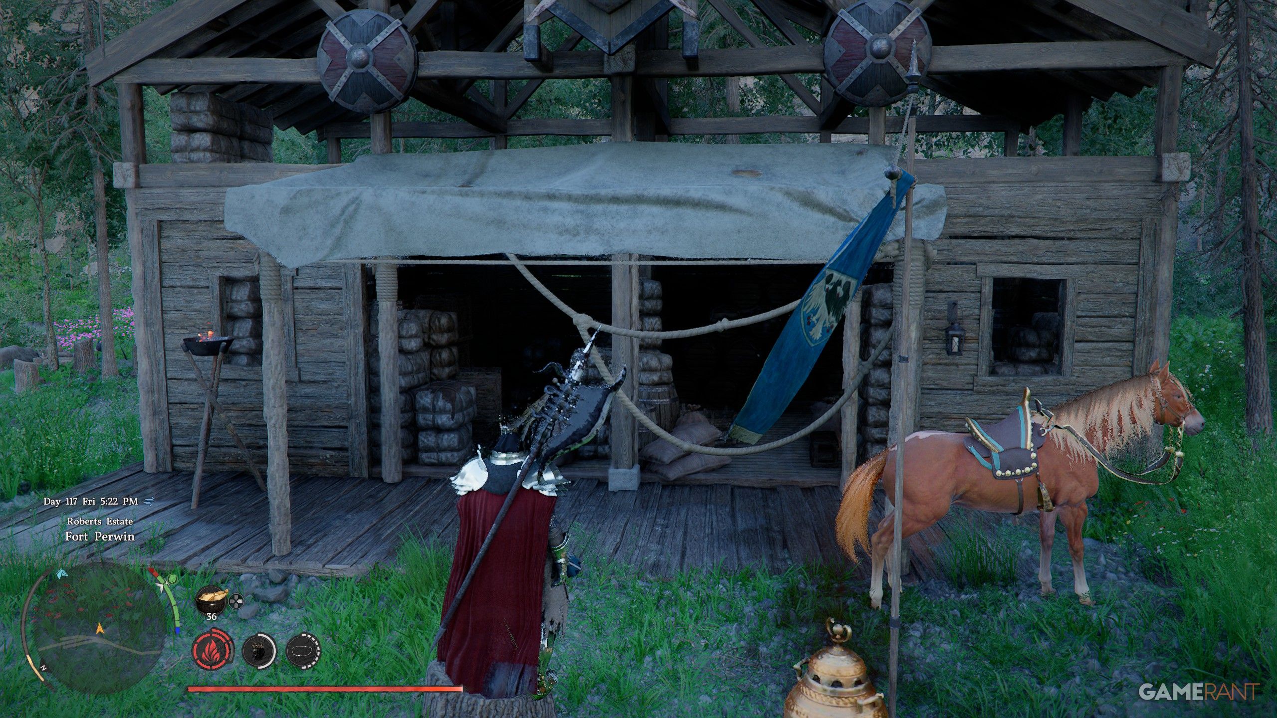 - Head southeast of the “D” in “Hernand”, just north of the Howling Hill Camp cliff, to find another Goldleaf Trading Post at the Serkis Estate.