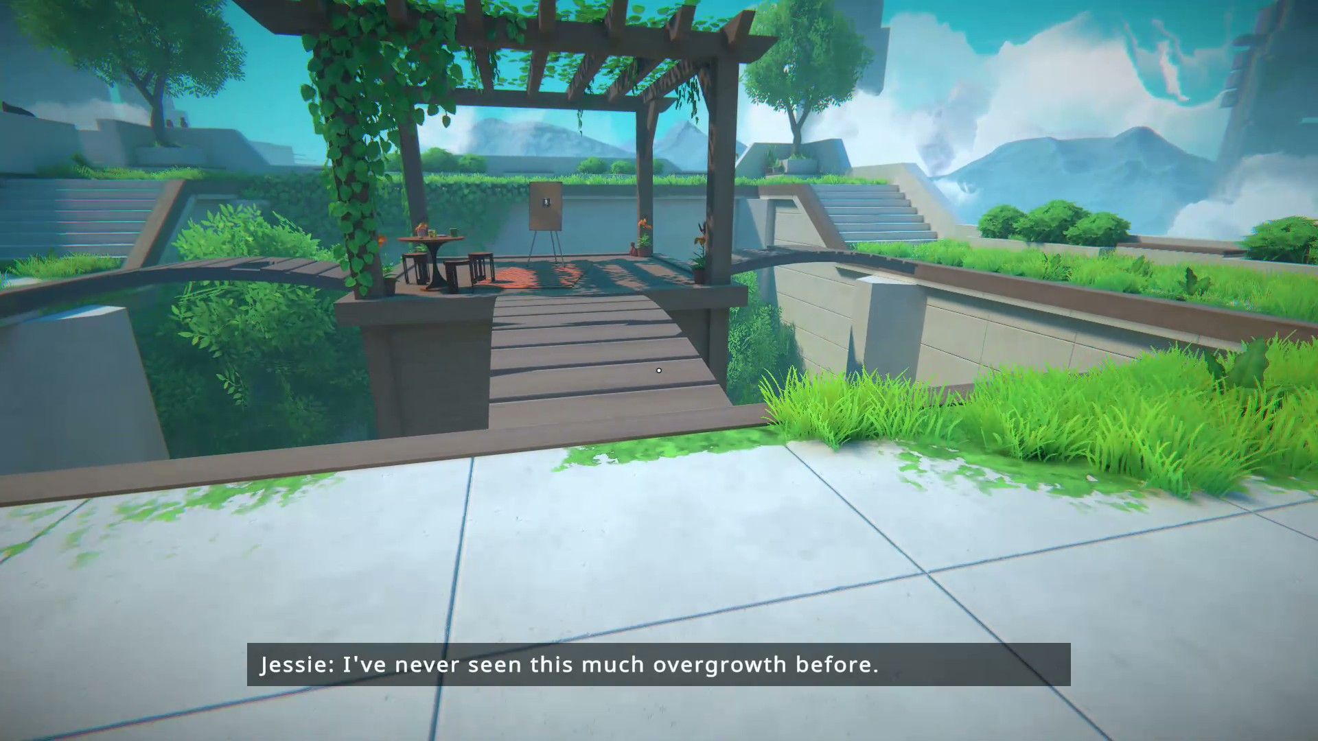 Once players use the first teleporter, they need to enter the house and go down the stairs to the patio. There, they’ll find a table with a board on it, and they need to go over and reach it.