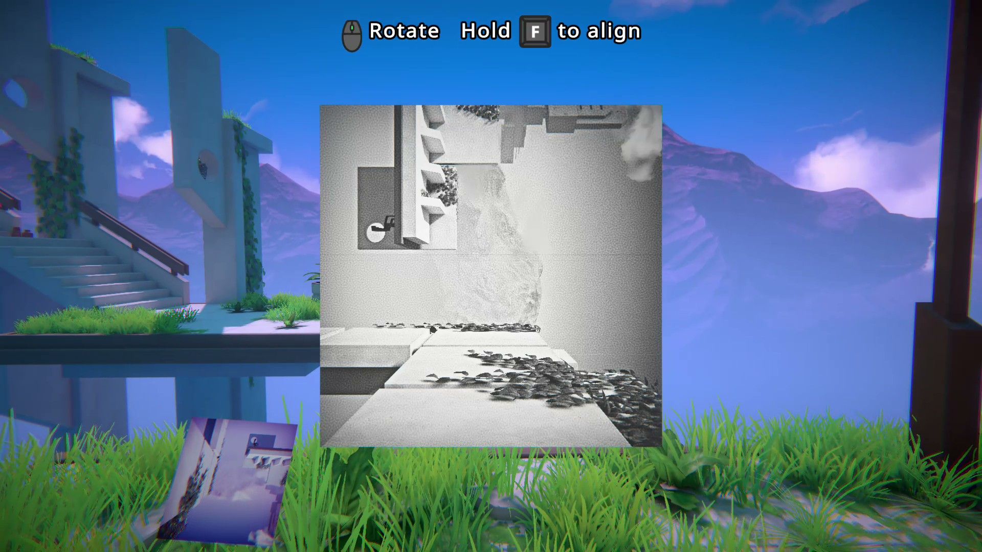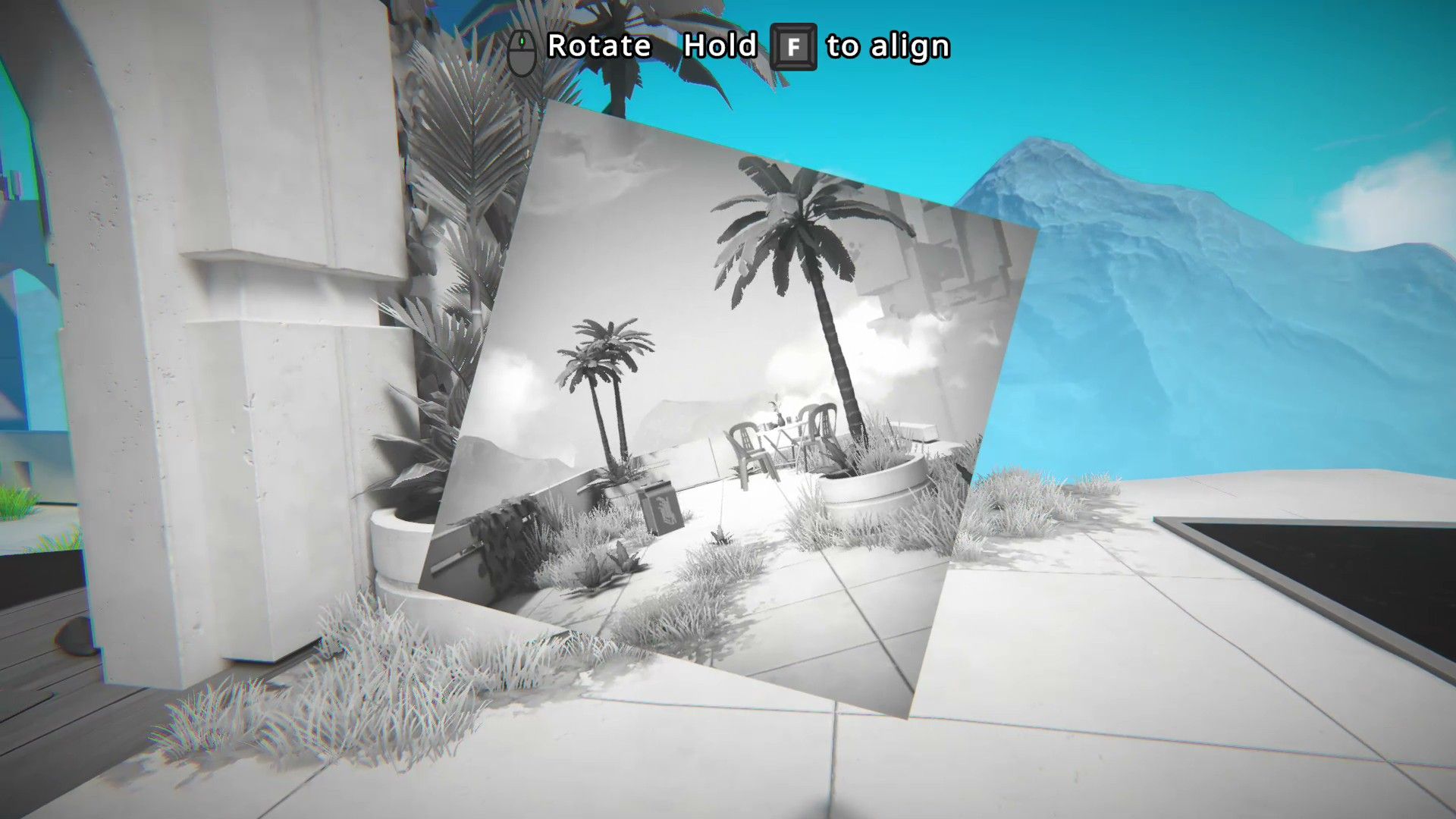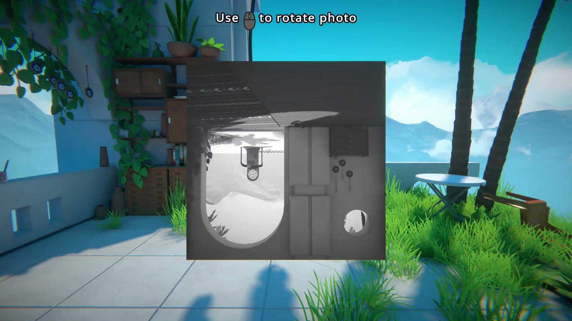 In the game Viewfinder, many puzzles involve rotating pictures to solve them. For example, in Level 1.3, players need to rotate a picture of a teleporter 180 degrees to make it right-side up. This allows them to access the teleporter and a battery needed to progress.