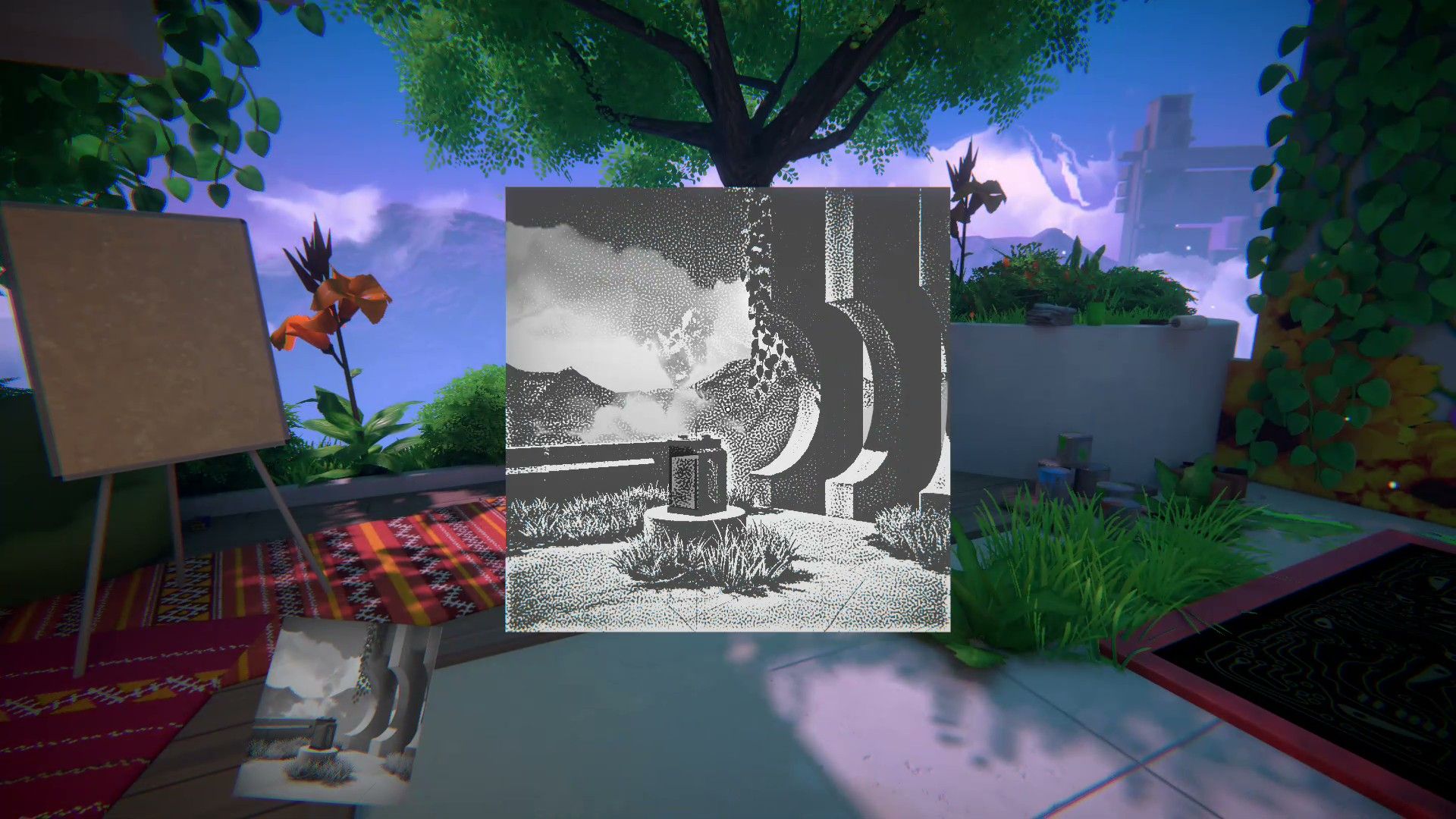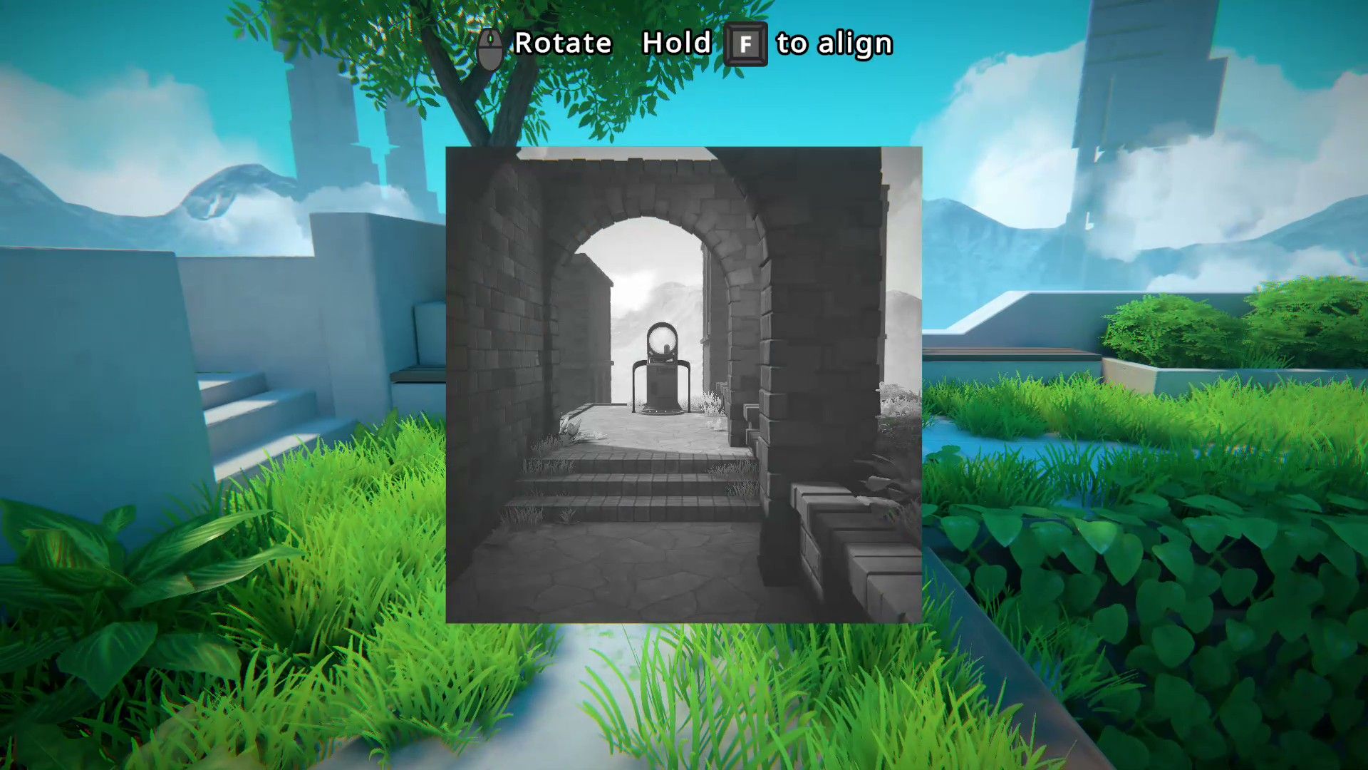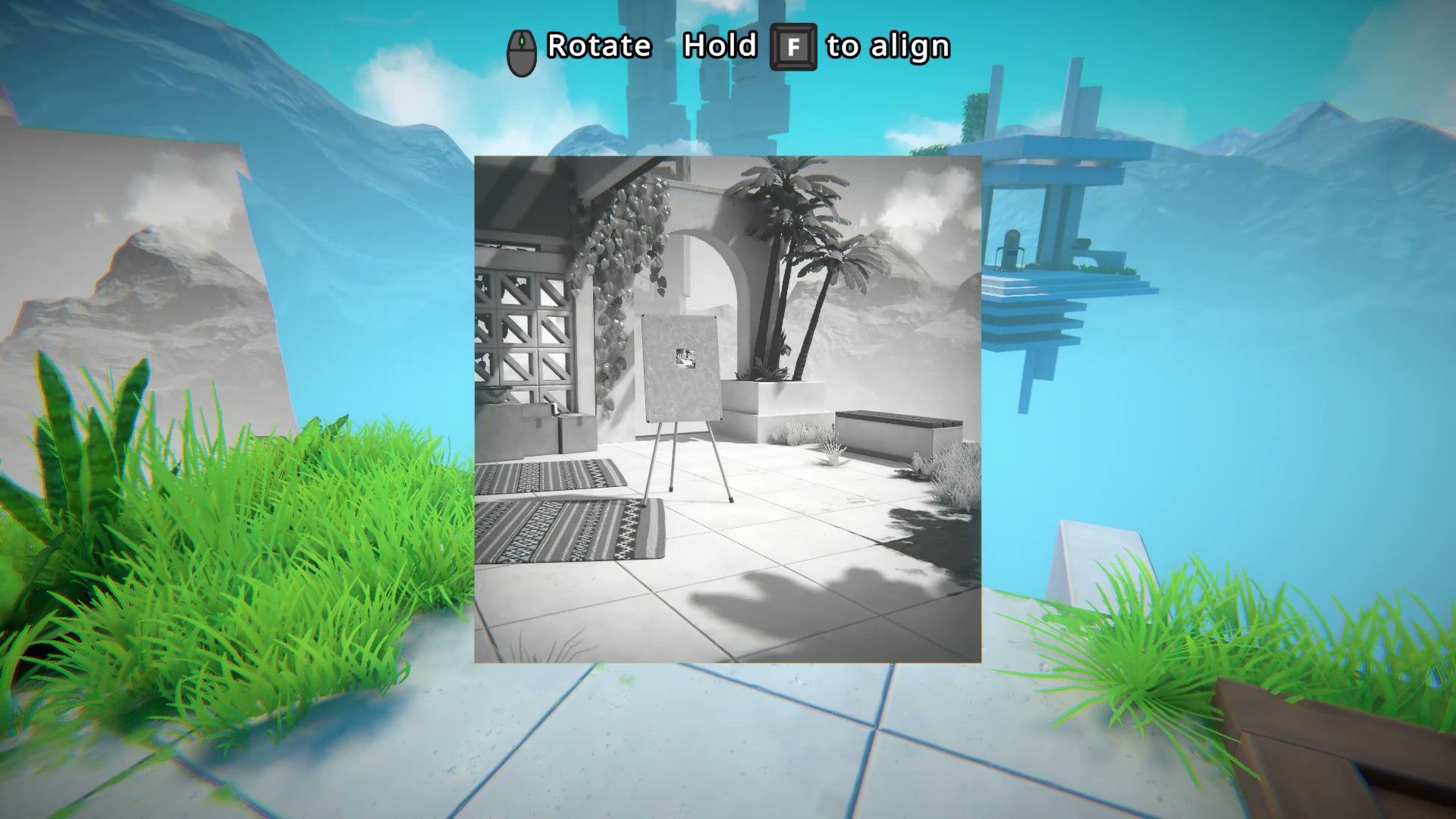 In the game Viewfinder, many puzzles involve rotating pictures to solve them. For example, in Level 1.3, players need to rotate a picture of a teleporter 180 degrees to make it right-side up. This allows them to access the teleporter and a battery needed to progress.