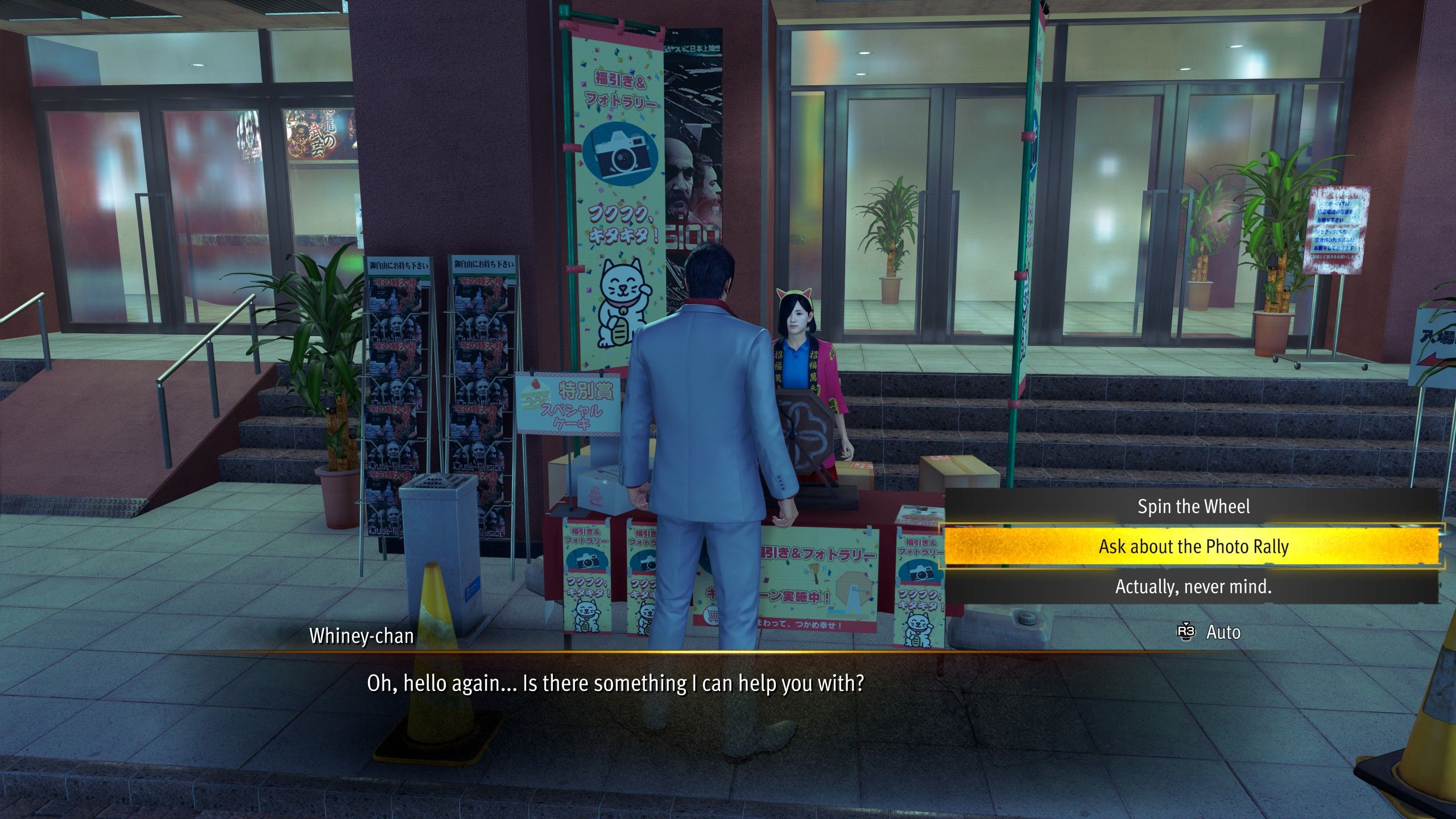 To get your prizes from the Kamurocho Fortune Finder Foto Rally, find Whiney-chan on Theater Ave. and choose the “Ask about the Photo Rally” option when you talk to her.