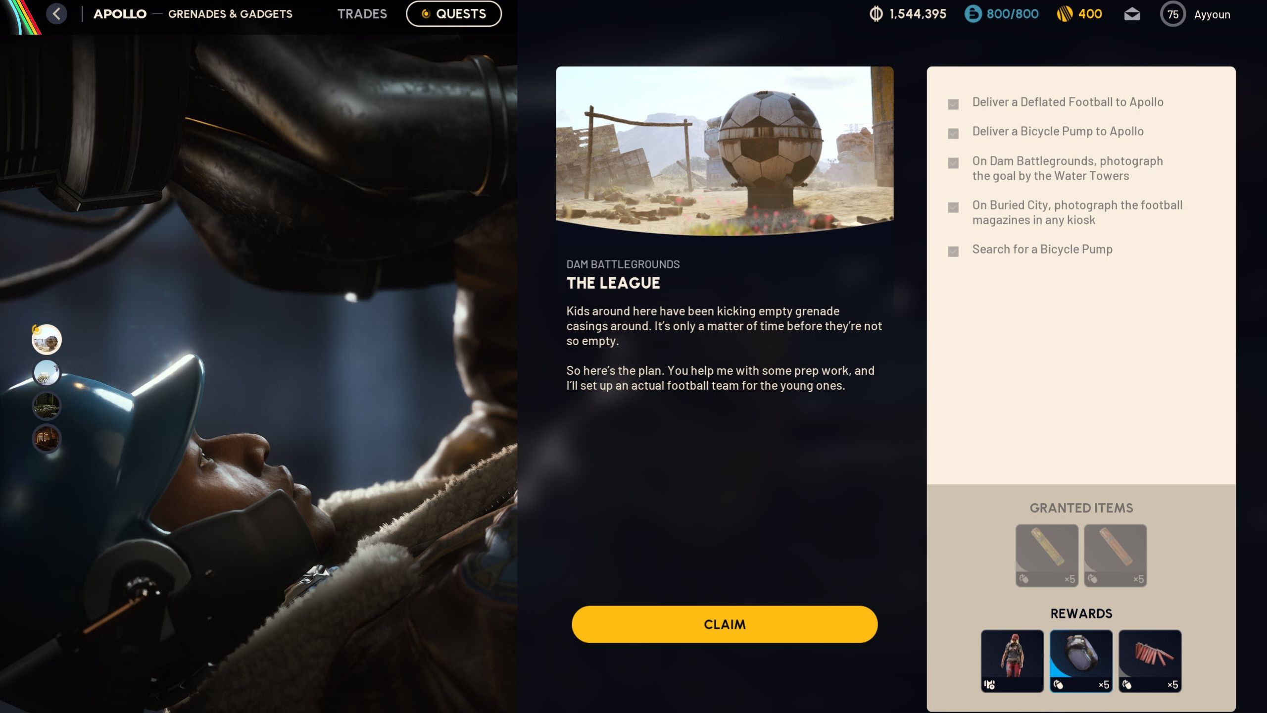 After you’ve taken the photos and gotten the Bicycle Pump and Deflated Football, return to Speranza and speak with Apollo. You’ll receive the Faded Flush outfit color, 5 Tagging Grenades, and 5 Firecrackers as a reward for finishing The League quest in ARC Raiders.