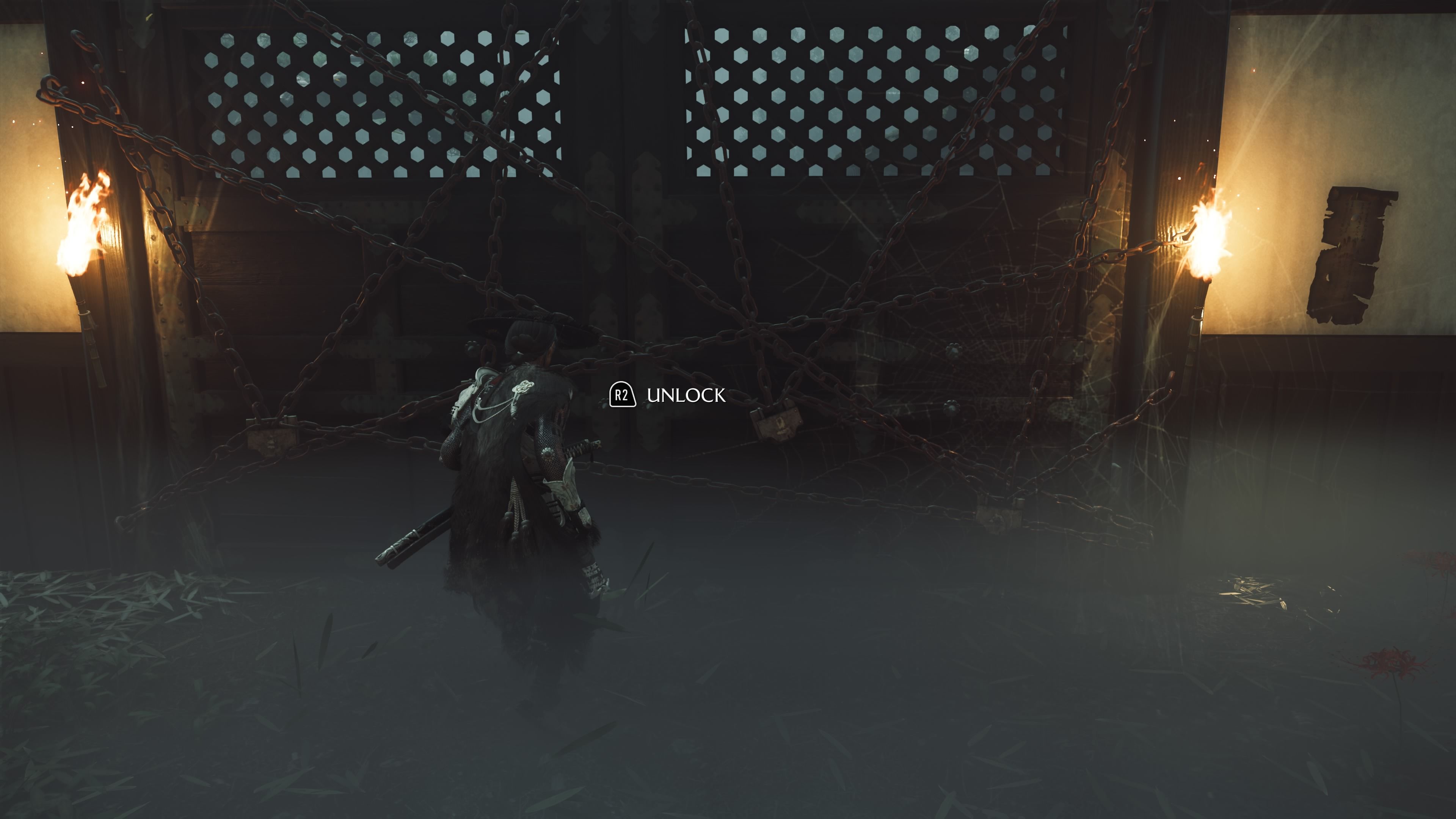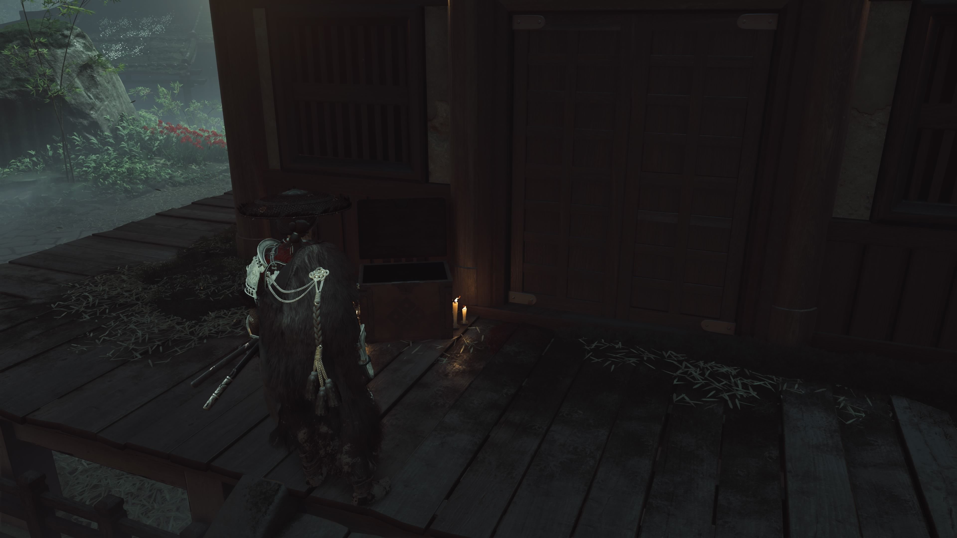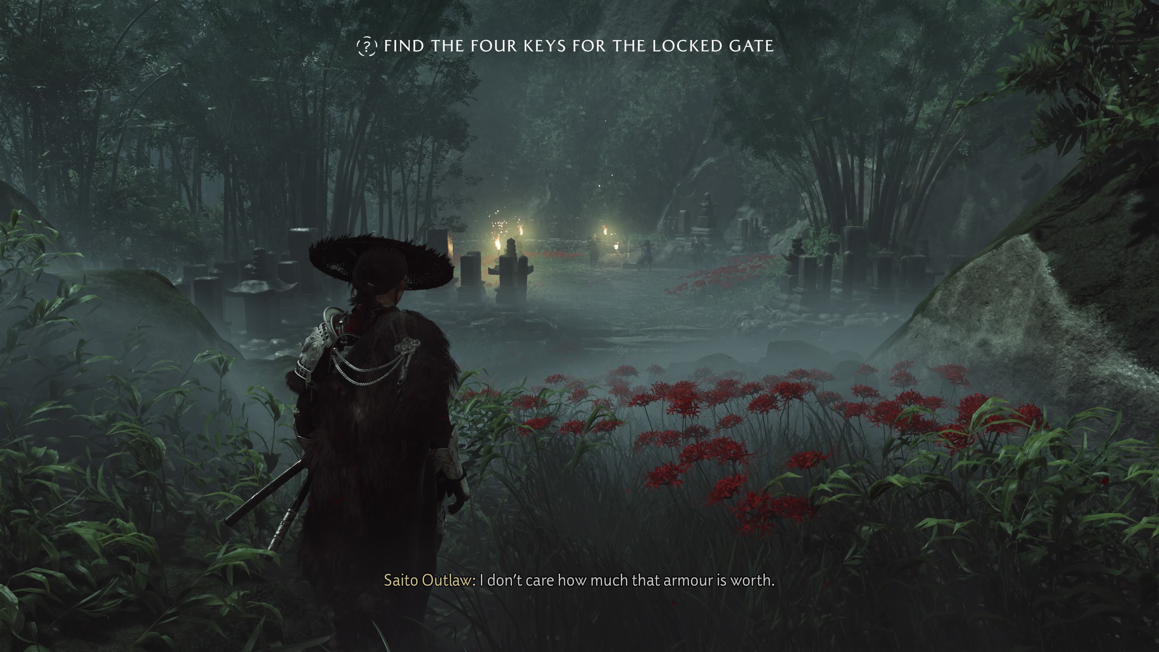 After collecting all four keys, go back to the locked gate at the Abandoned Tominaga Estate and interact with it to open the way forward. You can explore the building for additional story details, but it’s not essential. Simply go through the door on the right, which leads to the dueling yard. Continue along the straightforward path in the dueling yard until you reach a bamboo wall. Use your grapple to break through the wall, and then squeeze through the opening to confront the Spider Lily Genera.