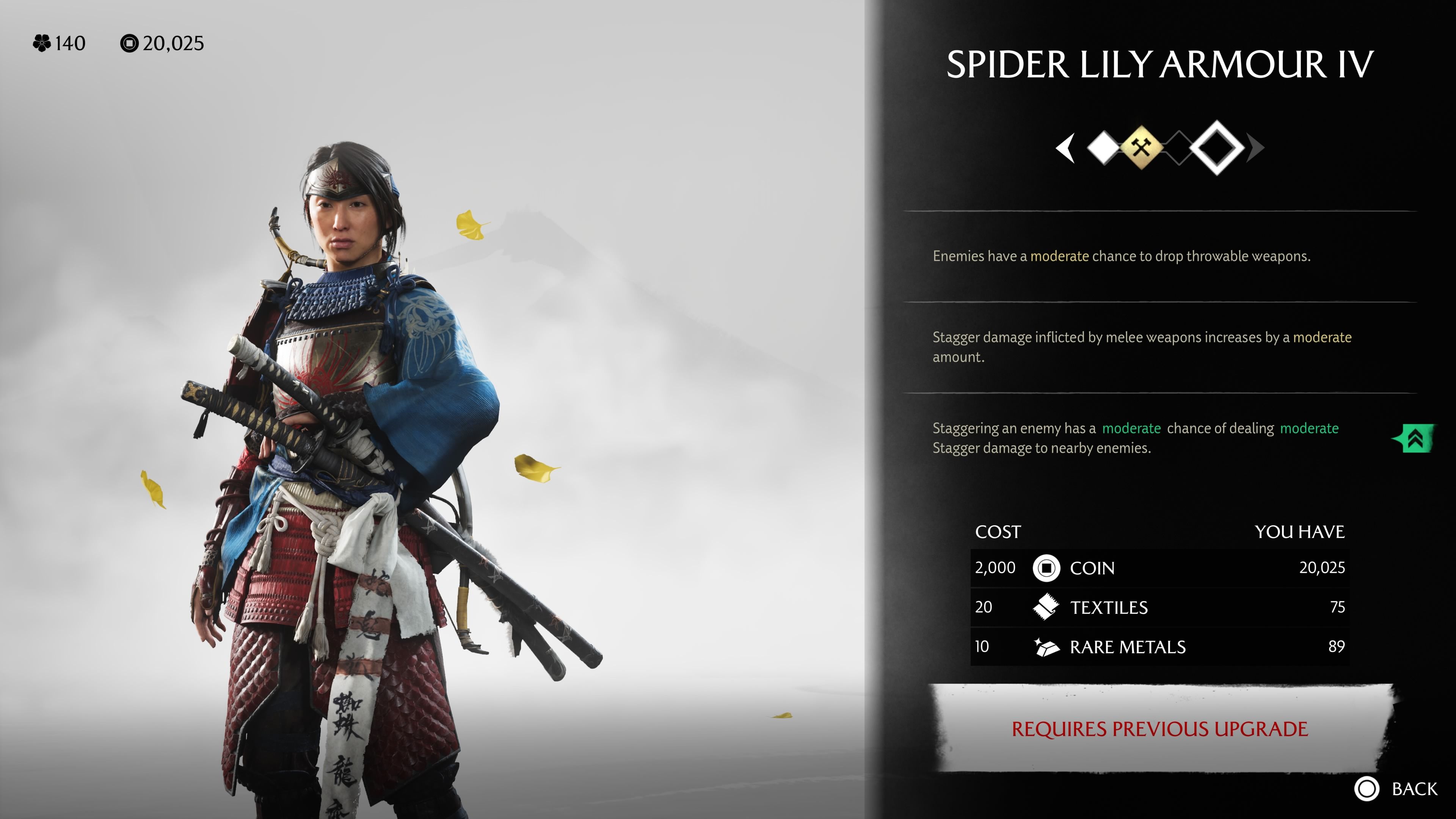 Players can improve this armor three more times by visiting the Armorer found in any Inn or Village, using Coin, Textiles, and Metals. Upgrading the armor will change the initial small benefit to a more significant, moderate buff. This Spider Lily Armor is particularly useful for players who prefer using thrown weapons and like to Stagger enemies-this can be done by successfully parrying attacks or breaking an enemy’s guard with Triangle button presses.