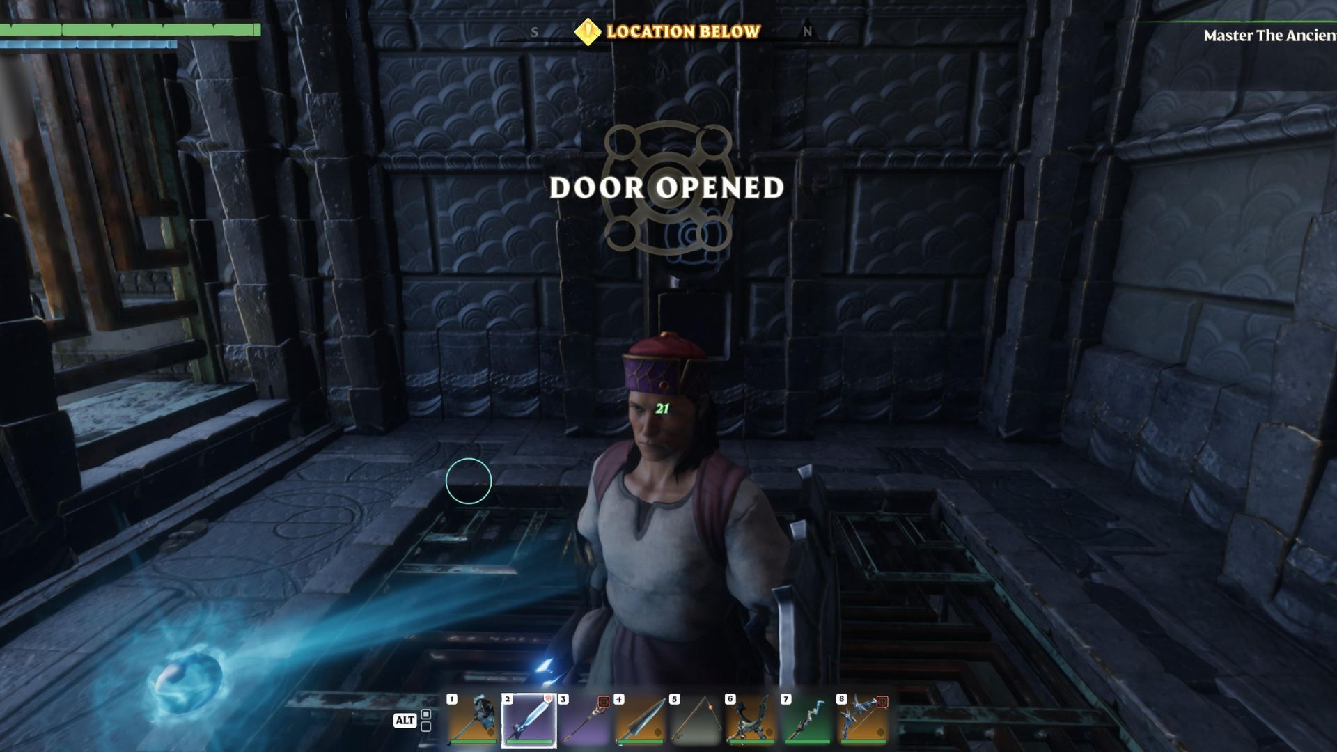 You’ve reached the top of the Veilwater Basin Ancient Spire! On the fourth floor, begin by heading through the door on the southeast side. This will lead you down a long hallway. As you walk, you’ll see another door on the southwest side – remember that one for later.