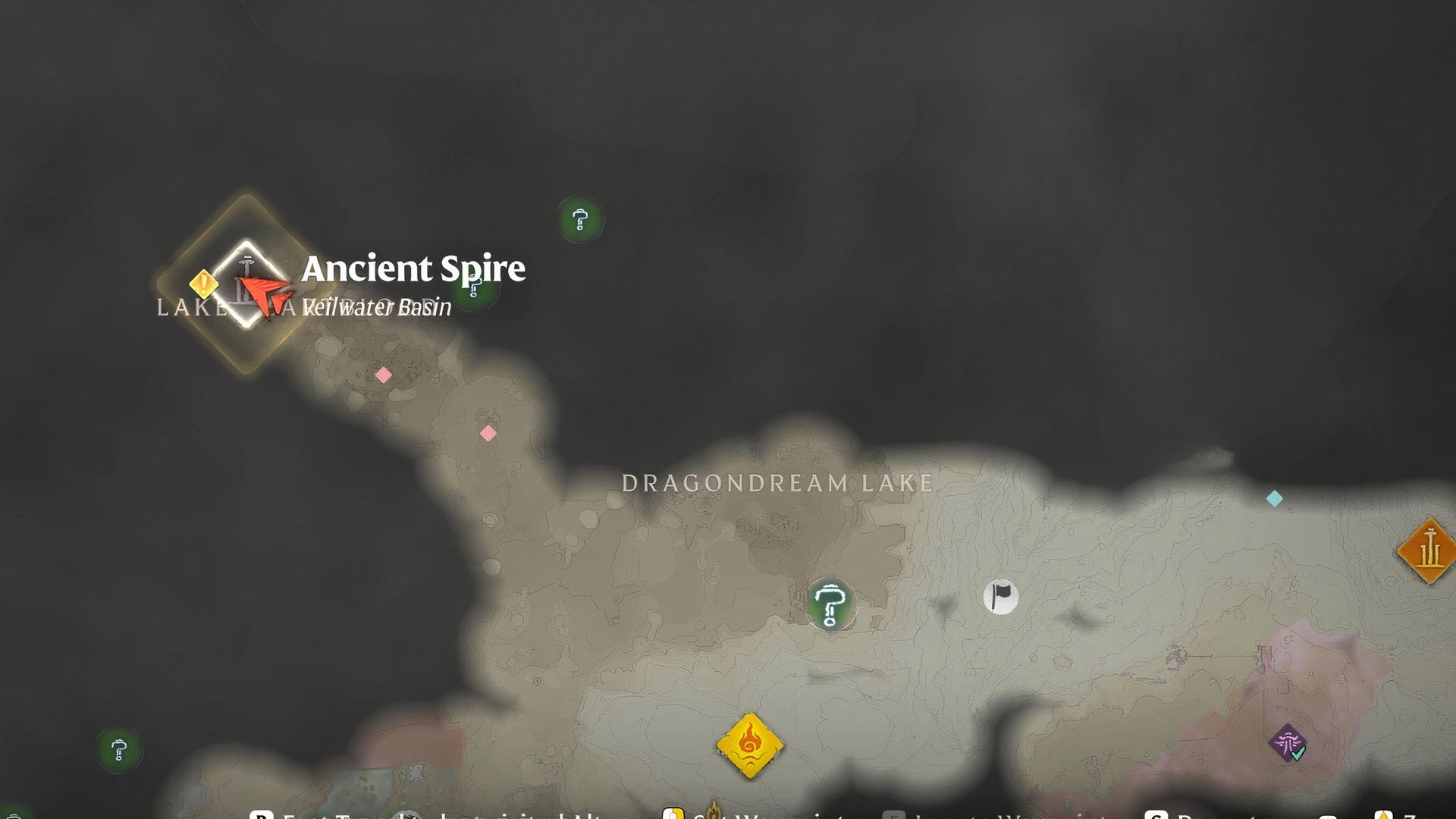 The Ancient Spire in Veilwater Basin is right in the middle of the area, close to Lake Heartblood. The best way to get there is to start from the Albaneve Summits – Ancient Spire fast travel point. From there, look towards the southwest side of the lake to find the main entrance to the basin.