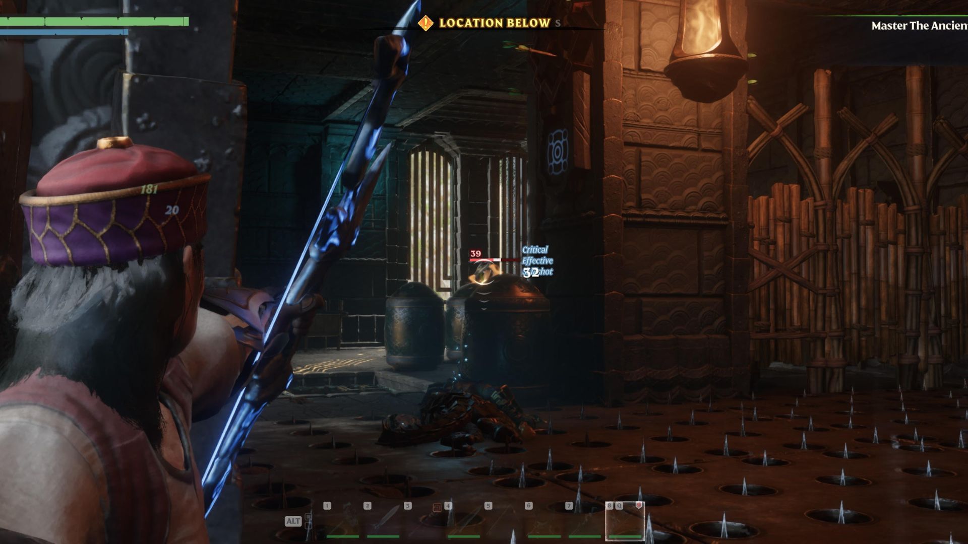 Once you’ve reached the third floor of the Veilwater Basin Ancient Spire, go north and cautiously make your way across the first row of spikes. You’ll see a climbable grate on your right, but hold off on going there for now. Your priority is to locate the three hidden buttons first.