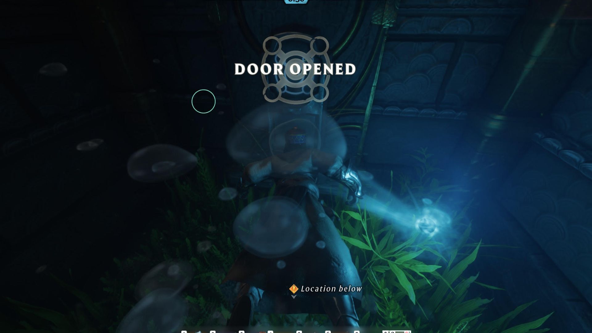 To open the doors, you’ll need to dive down a long, winding tunnel. You can reach the bottom with a single breath of air (it takes about 30 seconds), but it might take a few attempts to memorize the path. Swim quickly downwards, being careful to avoid the spinning blades. Once you reach the bottom, press the button to replenish your oxygen supply.