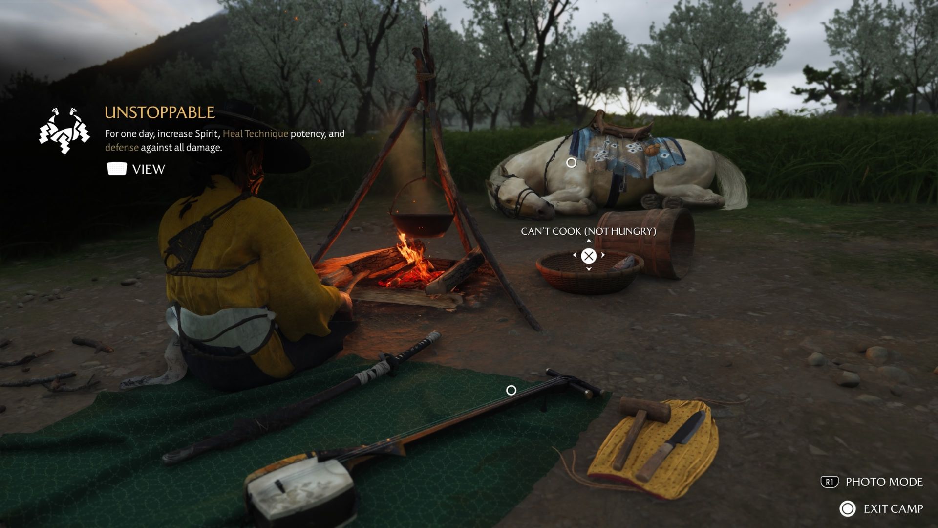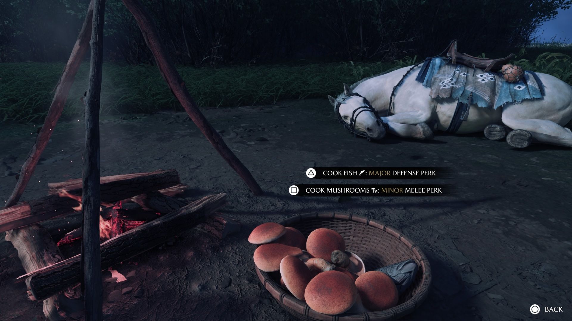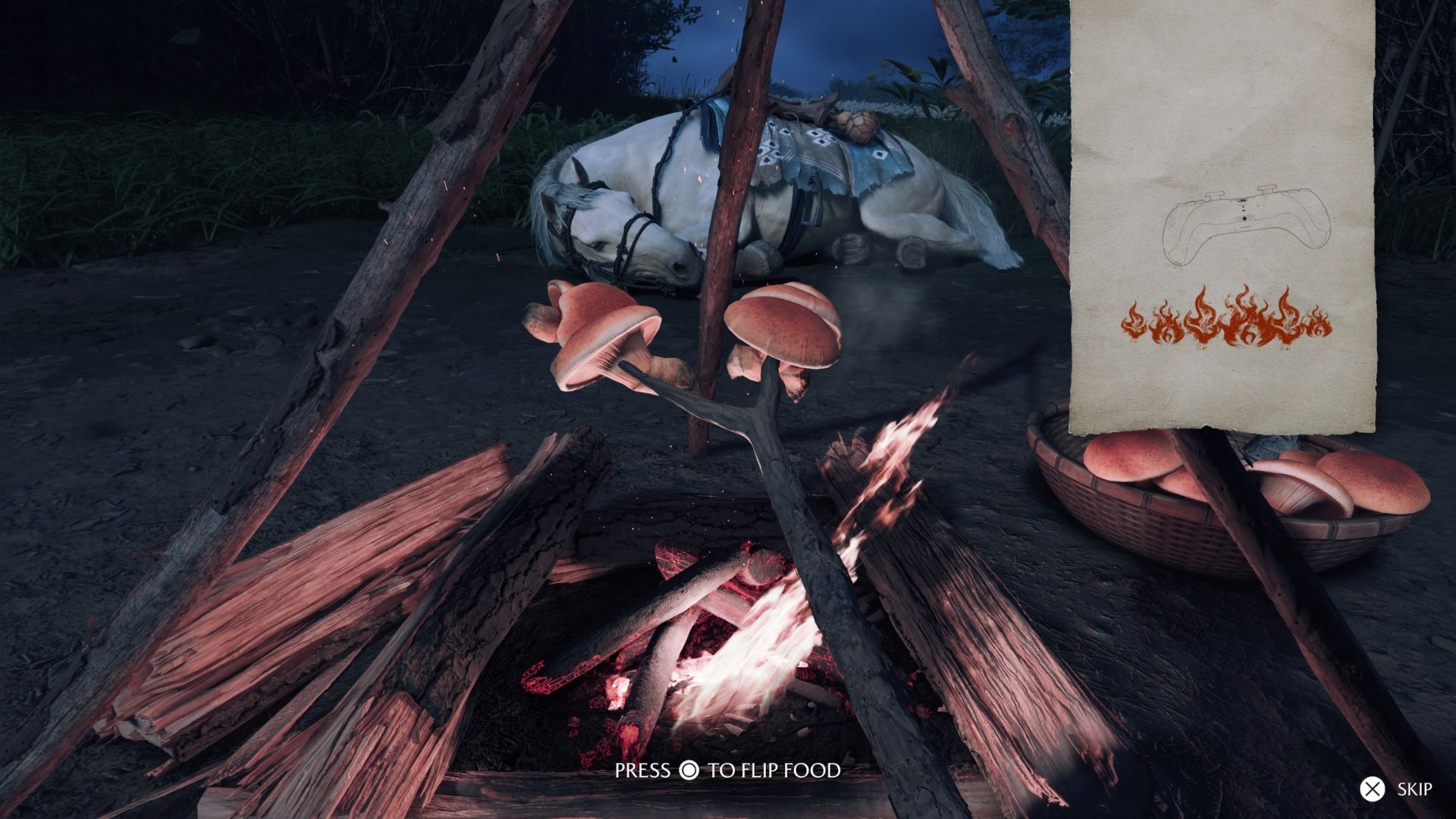 Atsu has the ability to cook fish or mushrooms while at a camp in Ghost of Yotei. To set up your own camp, or to rest at an existing Ainu camp, press and hold the left direction on the D-Pad while you are next to your horse, or even while riding it.