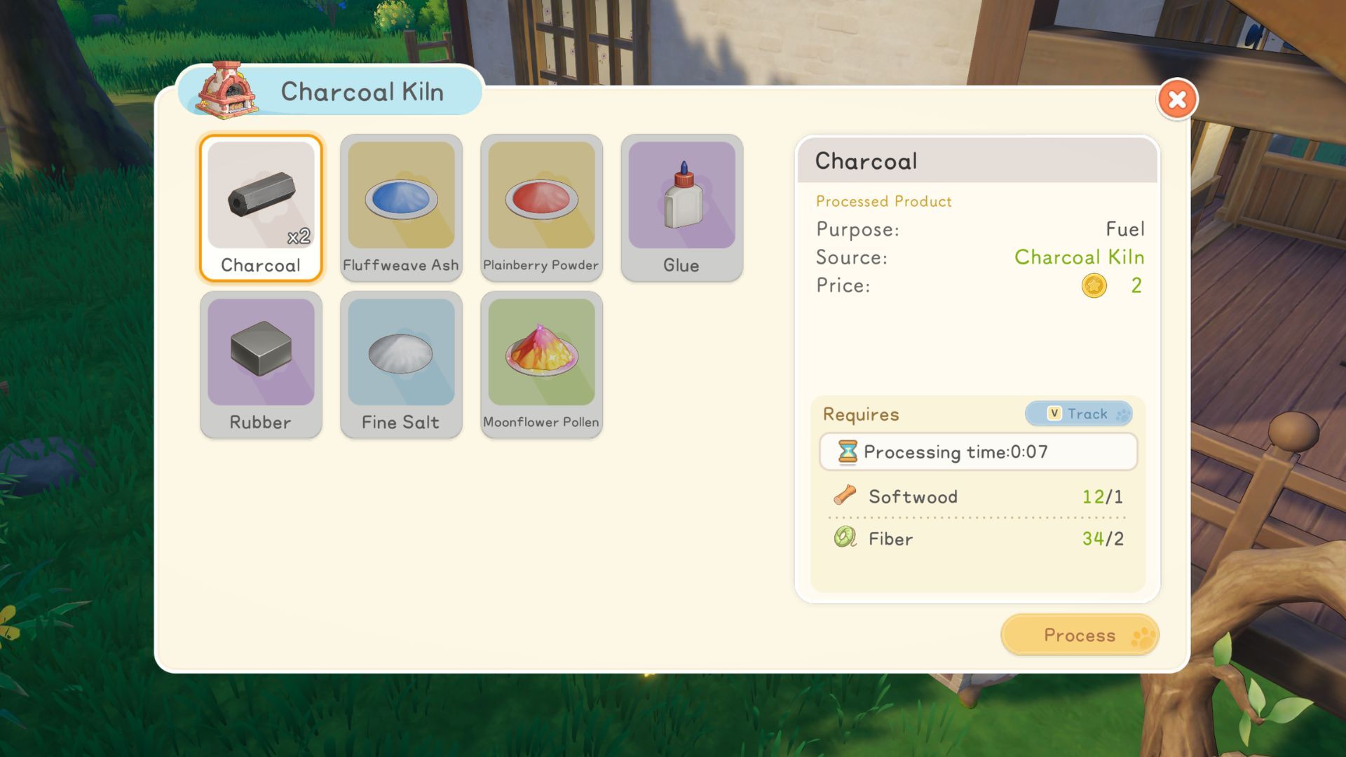 Charcoal is a bit harder to come by. First, you’ll need to build a Charcoal Kiln. You can craft one using 5 Stones, which you get by breaking rocks, at a Worktable. Then, you can use the Kiln to turn 1 Softwood and 2 Fiber into Charcoal.