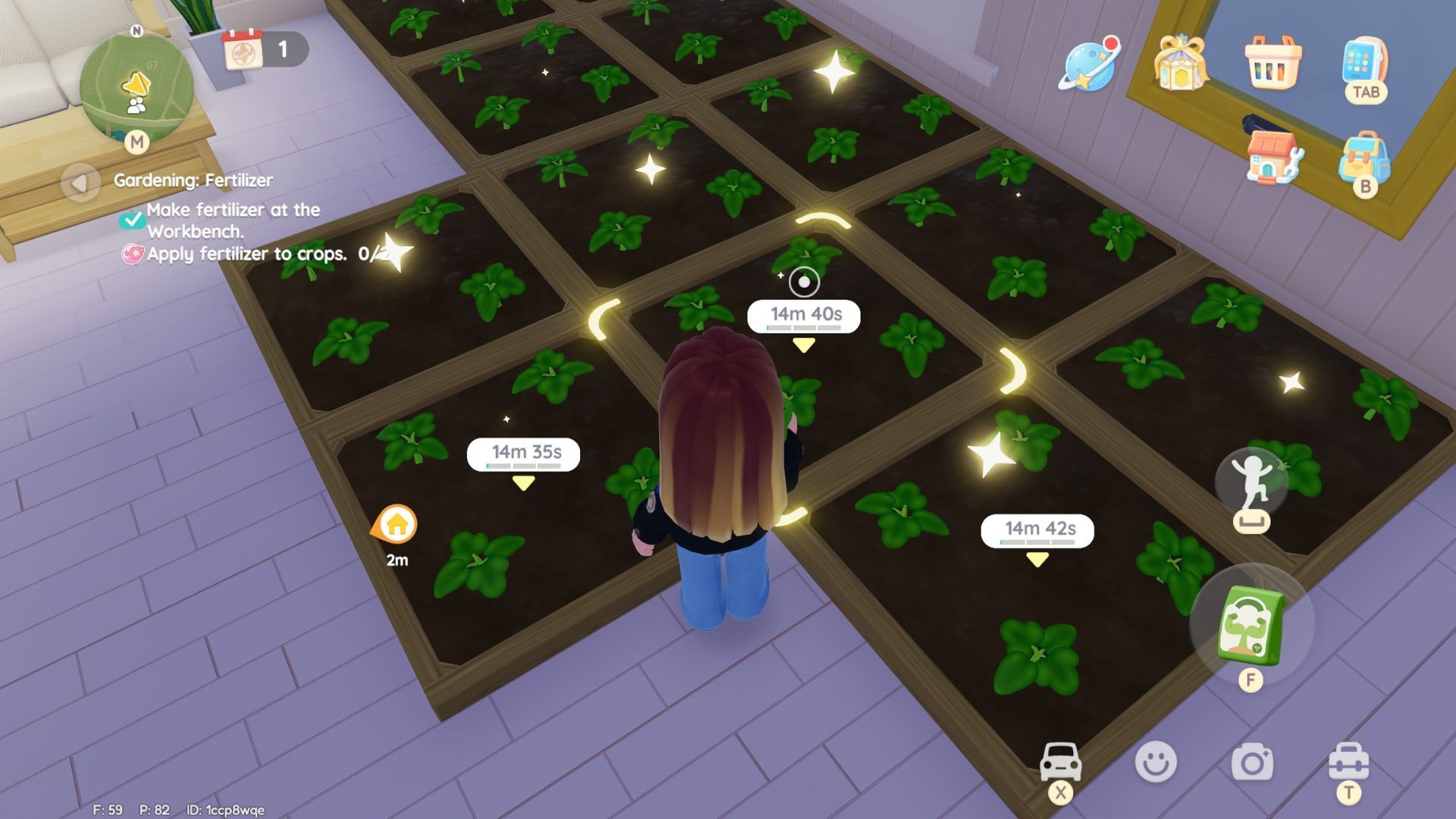 You can get wood by chopping down trees, and weeds by pulling them from your fields. Once you have enough of both, make two bags of fertilizer and put one on each of two different crops. You’ll know a crop has fertilizer because it will have small dots in the soil around it.