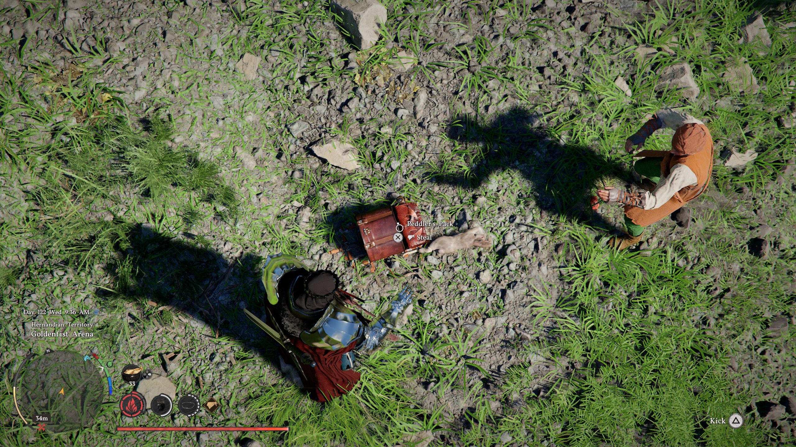 - With your weapon equipped, lock onto them (L1/LB), and they will get scared and drop their Peddler’s Pack, which you can now pick up from the floor.