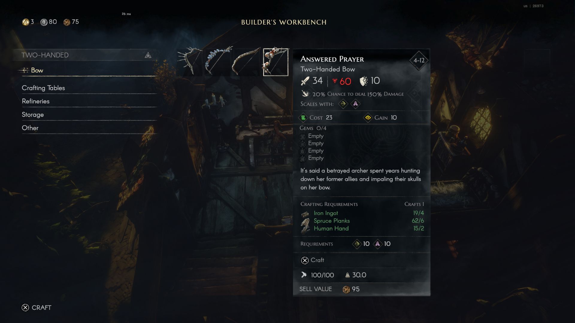Crafting the Answered Prayer bow, for example, needs Iron Ingots, Spruce Planks, and Human Hands. You’ll find these materials scattered throughout the game world, and often you’ll need tools to gather them.