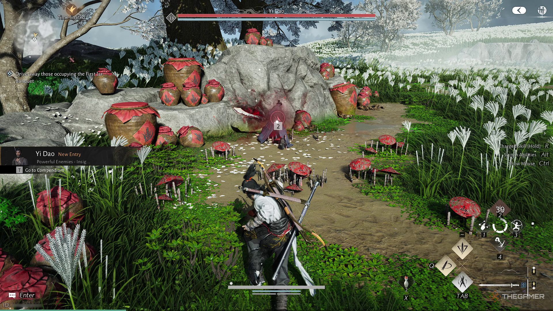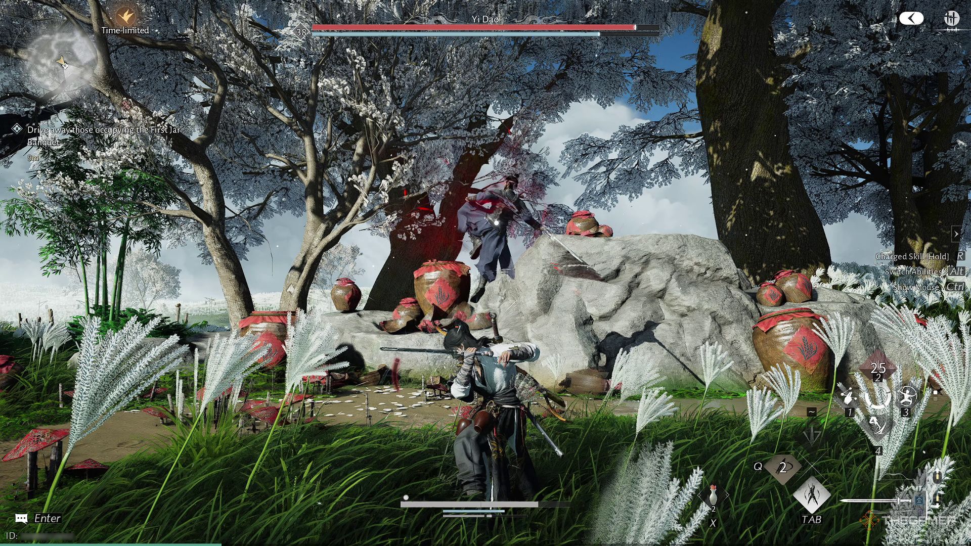 Yi Dao attacks in a way that’s hard to anticipate, combining sword strikes with forceful shoulder bumps. He doesn’t move around much during these attacks, so it’s better to dodge completely and wait for the combo to end, instead of trying to block each hit.
