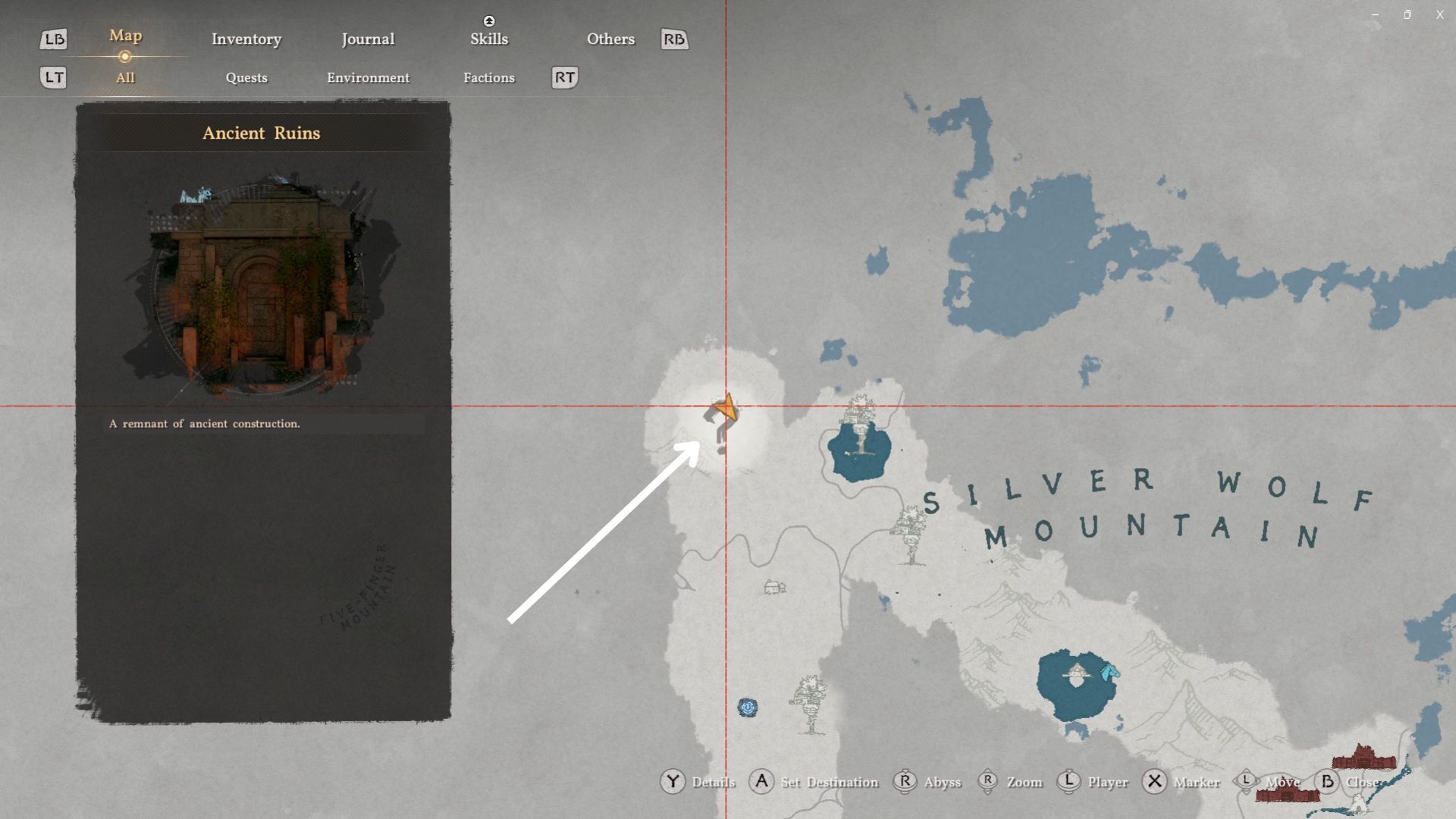 You’ll find the remains of the Five-Finger Mountain Valley to the west of Silver Wolf Mountain (pictured above). On your map, they’re simply marked as ancient ruins.
