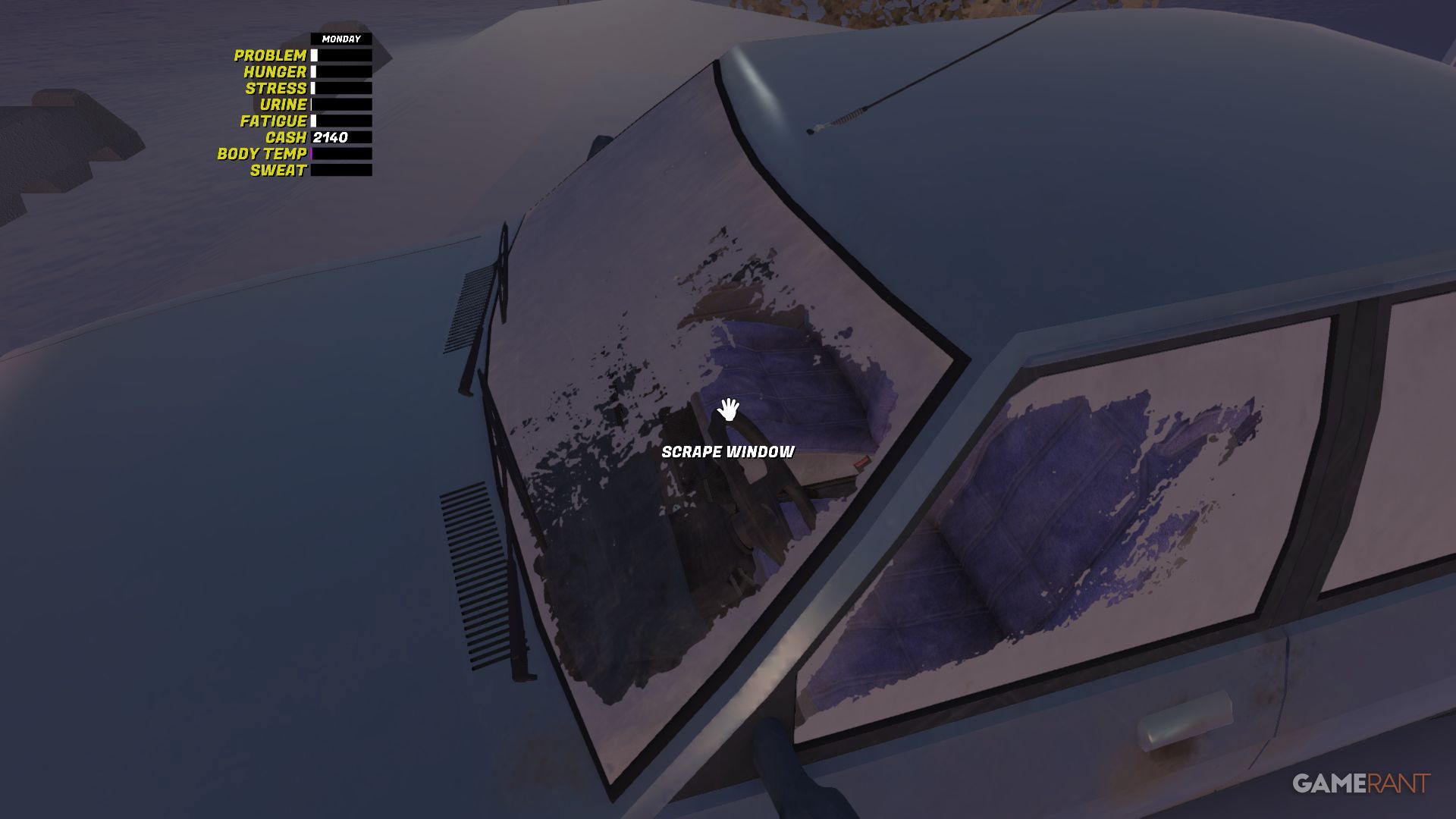 The heater will eventually defrost your windows, but you can make it faster by scraping them. Go outside your car and, when a hand icon appears above each window, hold down the left mouse button and drag it downwards to scrape away the frost, starting from the top.