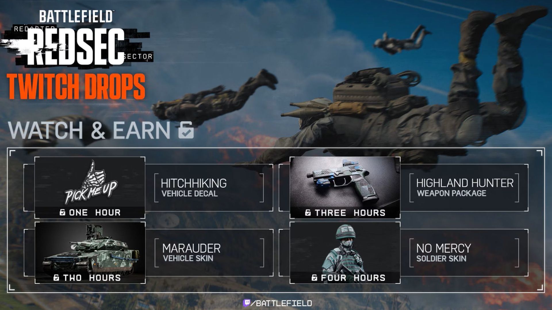 EA announced that from October 28th at 8 AM PT to November 4th at 11:59 PM PT, viewers can earn in-game rewards like a Weapons Package and a Soldier Skin by watching their favorite streamers play Battlefield REDSEC on Twitch. These are known as REDSEC Twitch Drops and were available during the first week of Battlefield REDSEC Season 1.