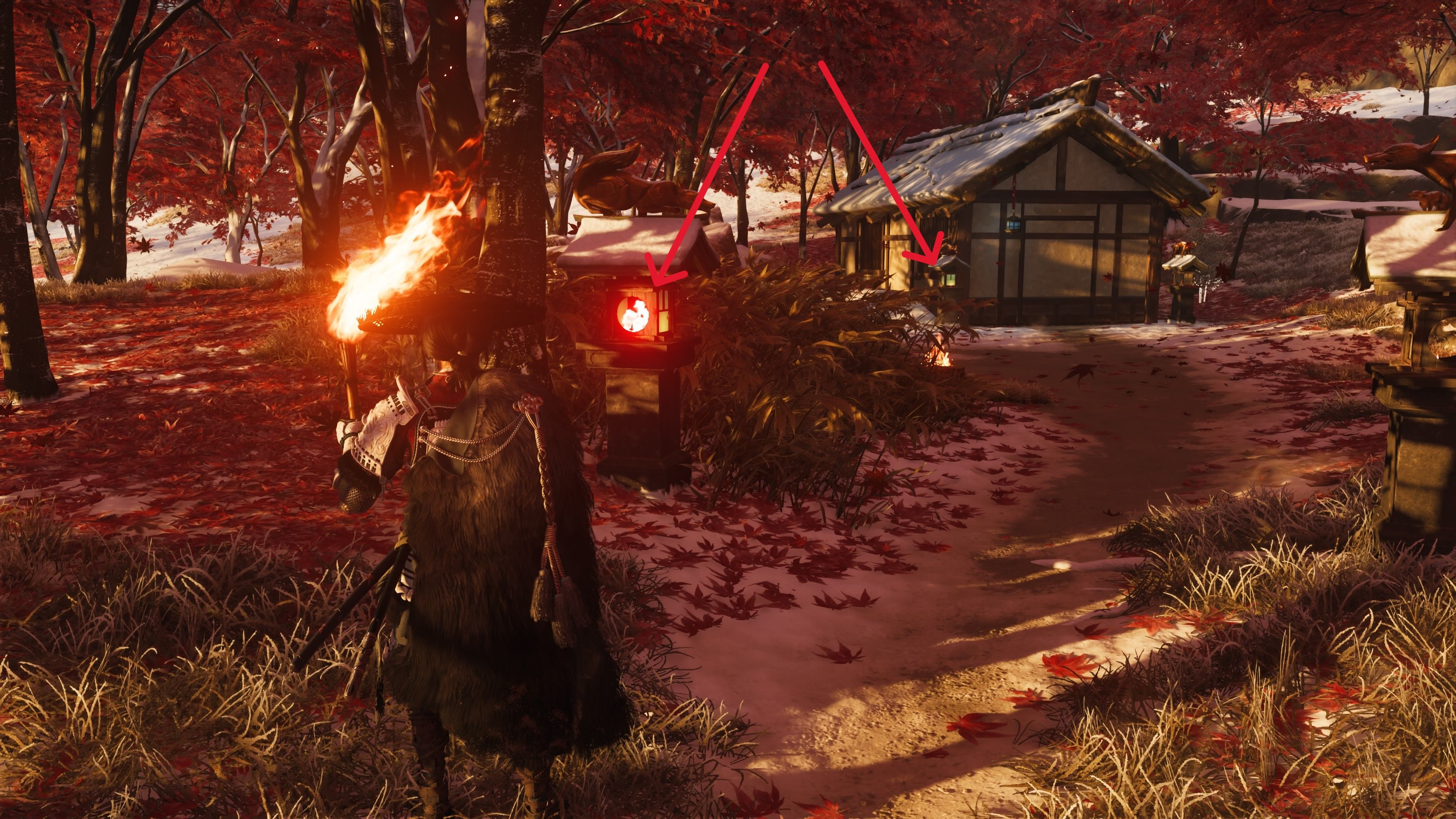 To the right of the building, you’ll see two fox statues with a torch between them in a holder. Take the torch. Next, you need to find and light the two lanterns that have a reclining fox statue above each one. Be careful not to light the pyre with the seated fox, as that will lead to your demise. These statues are located to the left of the Closed-Off Building, and to the left of the entrance, leaning against a tree. After you’ve done that, go inside the building and collect the Altar of Reflection for a skill point, as well as the Intelligence Report, which points to an old man at the Red Crane Inn who might be worth talking to.