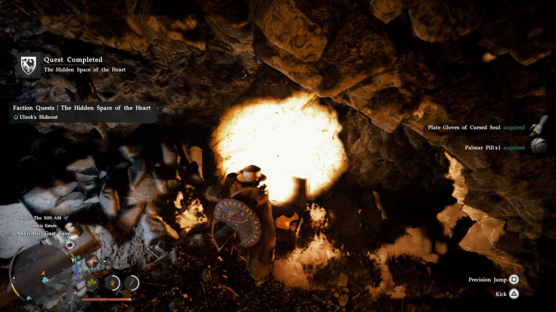 During the “Hidden Space of the Heart” quest in Crimson Desert, you need to use the Focused Force Palm skill on the glowing rocks to get into Ulzok’s Hideout. You usually learn this skill in Chapter 4 by activating Focus Mode and then using the Force Palm command. Once inside Ulzok’s Hideout in Crimson Desert, you can find a chest containing the Cursed Soul Plate Gloves and a Palmer Pill. Completing the quest also gives you three extra inventory slots.