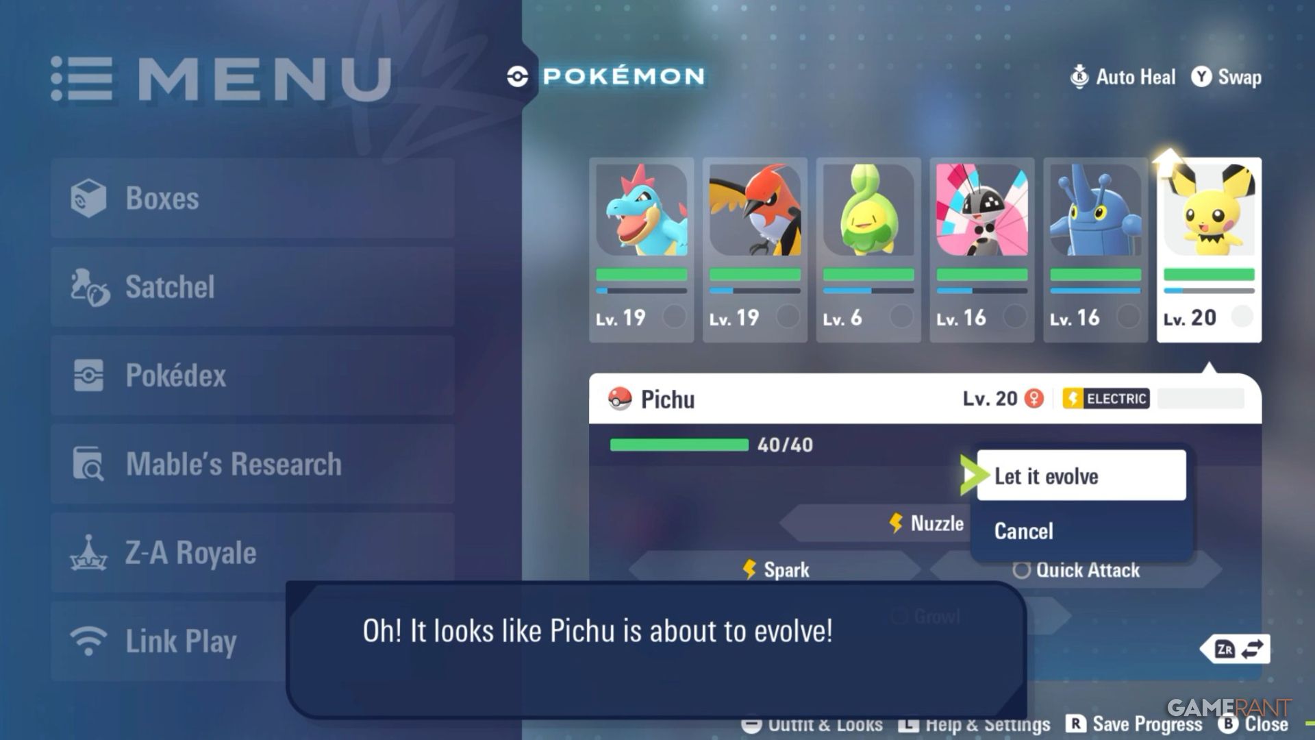 In Pokemon Legends: Z-A, Pichu will evolve into Pikachu when it’s very close to you – meaning you’ve built up a strong friendship. Currently, there’s no way to see exactly *how* close you are to a Pokemon, but we were able to evolve our Pichu into Pikachu at level 20 simply by having it in our party and giving it Exp. Candies.