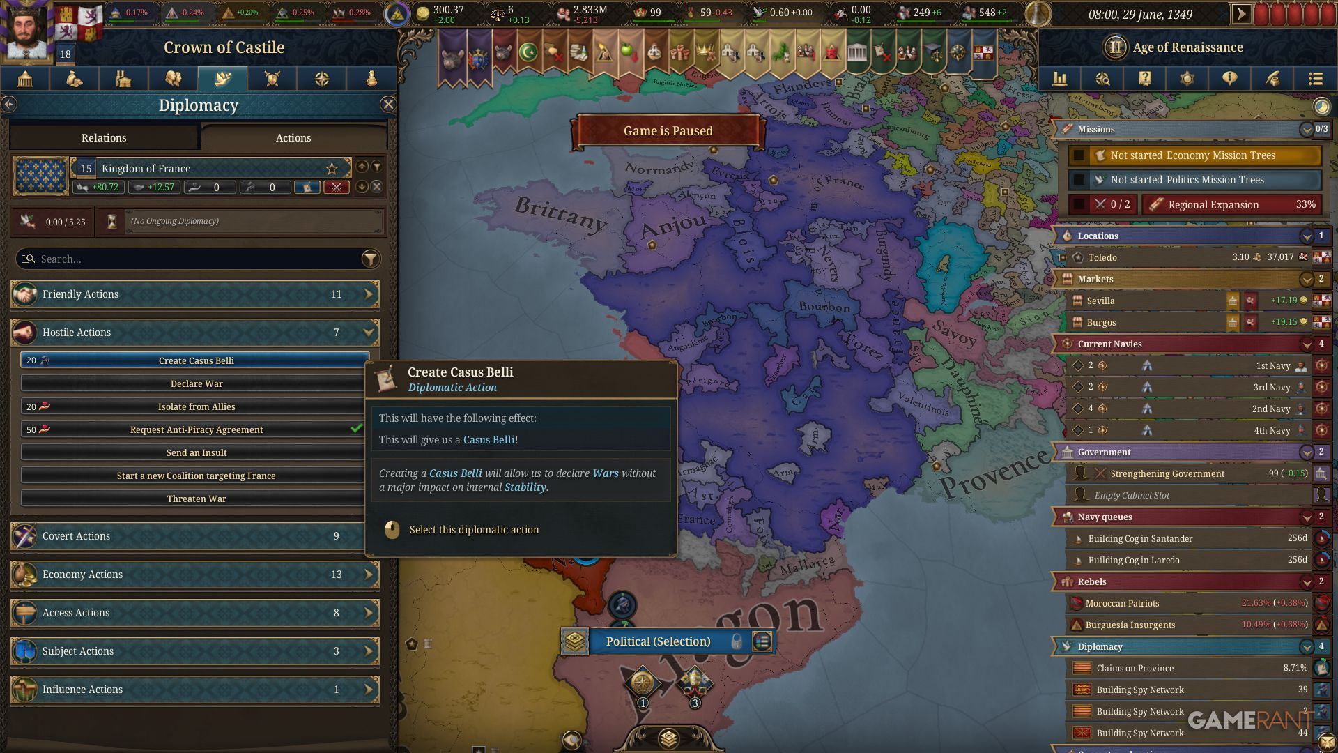 After you’ve collected 20 spies, you can start creating a reason for war. Go back to the main menu by clicking on the country you’re dealing with, then choose ‘Create Casus Belli’ from the ‘Hostile Actions’ list.