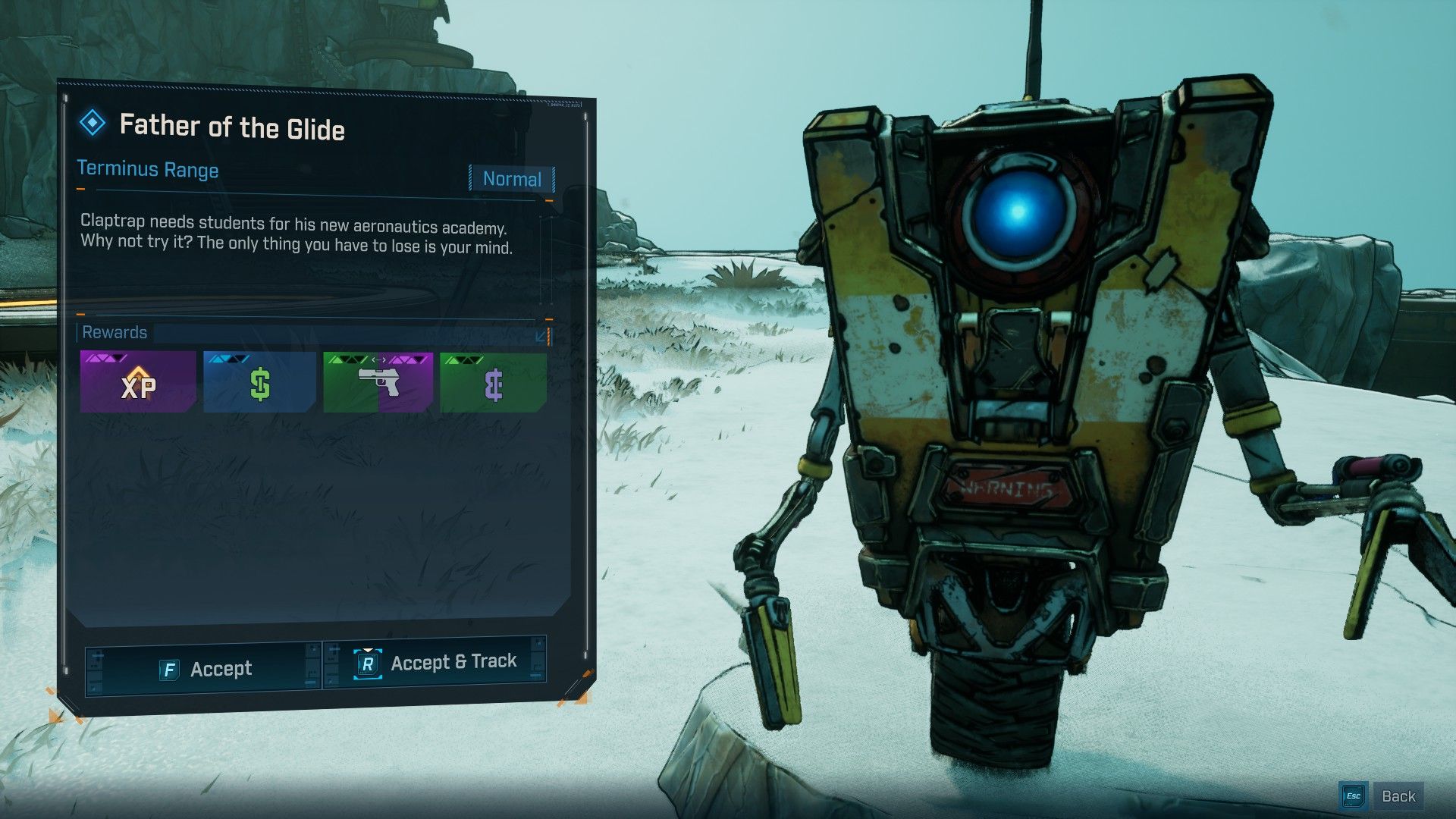 To locate the Claptrap mission, players should journey to the Stoneblood Forest within Terminus Range. In the west of Snowy Wells, you’ll discover the Claptrap Aeronautics Academy point of interest. Here at this location, Claptrap is hanging out on a hovercraft. This mission is quite straightforward and Claptrap invites players to have fun with an obstacle course using their grapple hook and jetpack. There’s no need to harm anything during the course of this adventure.