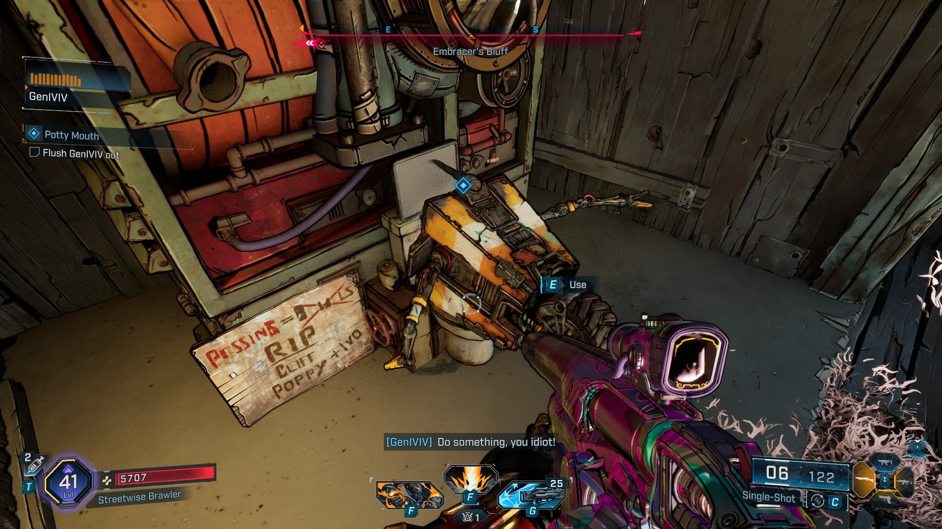 As an enthusiastic gamer, I can’t wait to embark on this thrilling adventure that transports me to Lopside in Carcadia Burn. At the Embracer’s Bluff Point of Interest, a unique find awaits – a sentient toilet AI, none other than the menacing GenIVIV from Borderlands 3! This villain is back with a vengeance, and it seems his revenge comes in the form of flushes. Engaging in conversation with GenIVIV triggers the Clap Signal, summoning the ever-entertaining Claptrap. This marks the beginning of what promises to be the longest and bloodiest quest in Claptrap’s collection!