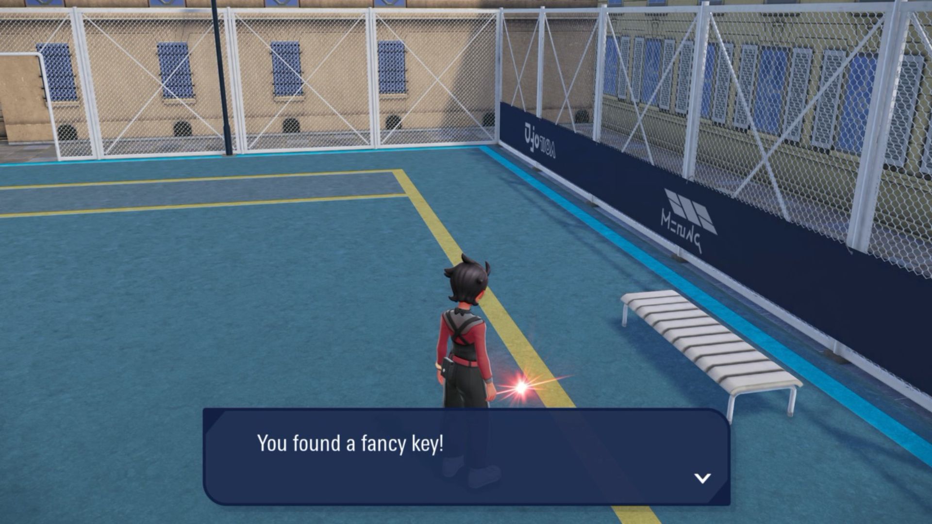 Head down the alley, and you’ll find the battle court on your left. Go inside, and you’ll see a shiny red item on the floor – it’s the fancy key Cadena needs! Once you pick it up, a cutscene will play, and Cadena will appear to thank you and give you a reward.