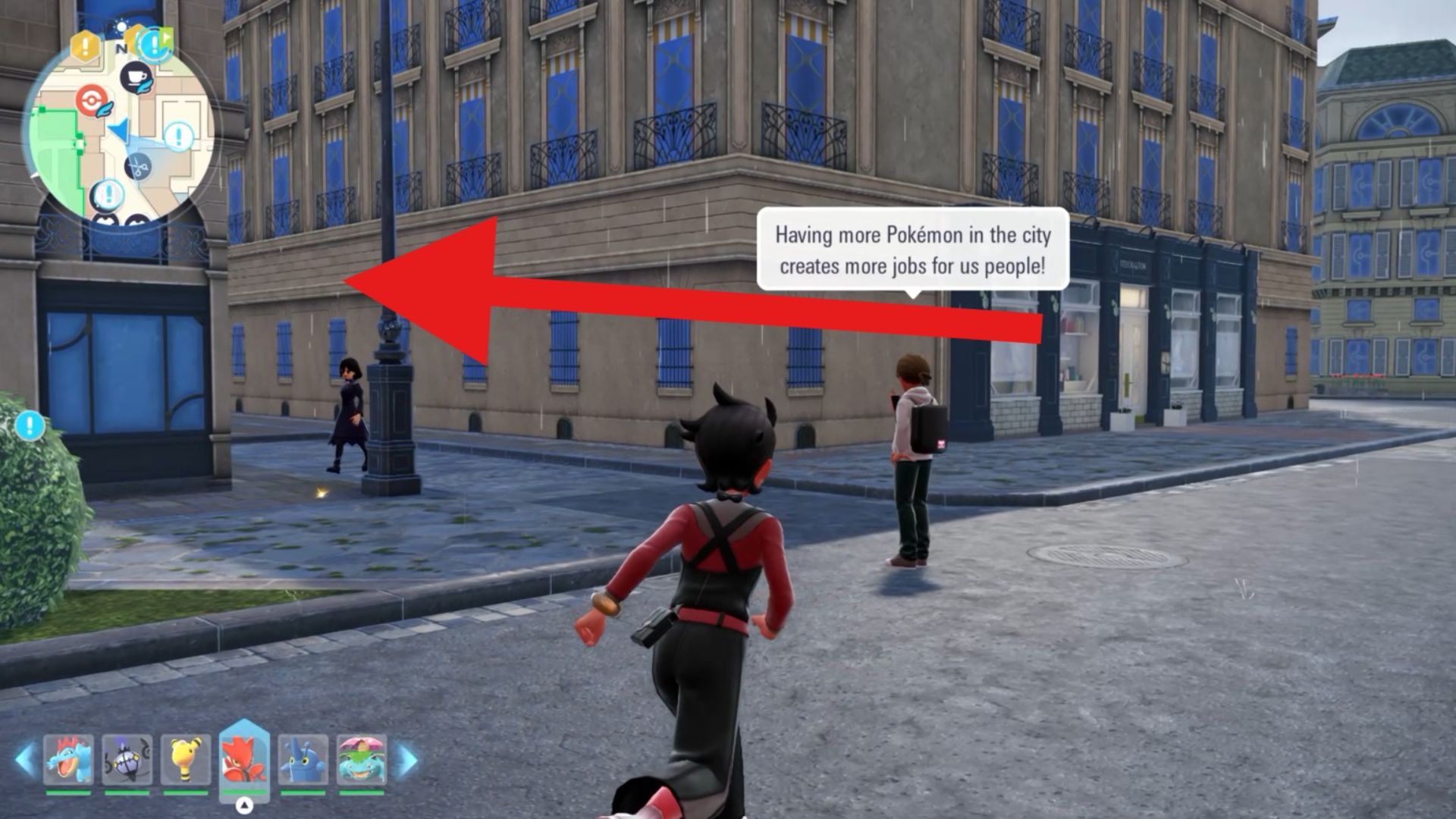 If you use fast travel to reach the Pokémon Center near Aymlis Park, head south right away. Then, turn left when you spot an alleyway – if you pass the Stone shop, you’ve gone too far!