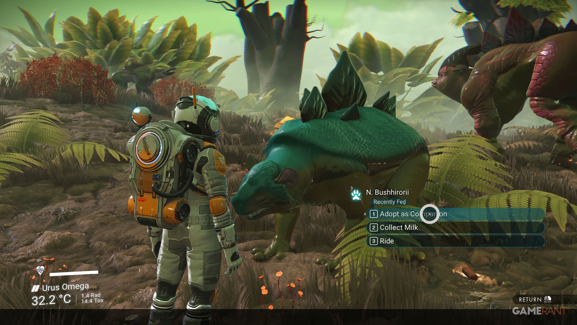 To tame a creature, approach it and hold down the ‘E’ key while feeding it pellets. Once tamed, pressing ‘E’ again will bring up a menu of options, including the ability to ‘Adopt as Companion’.