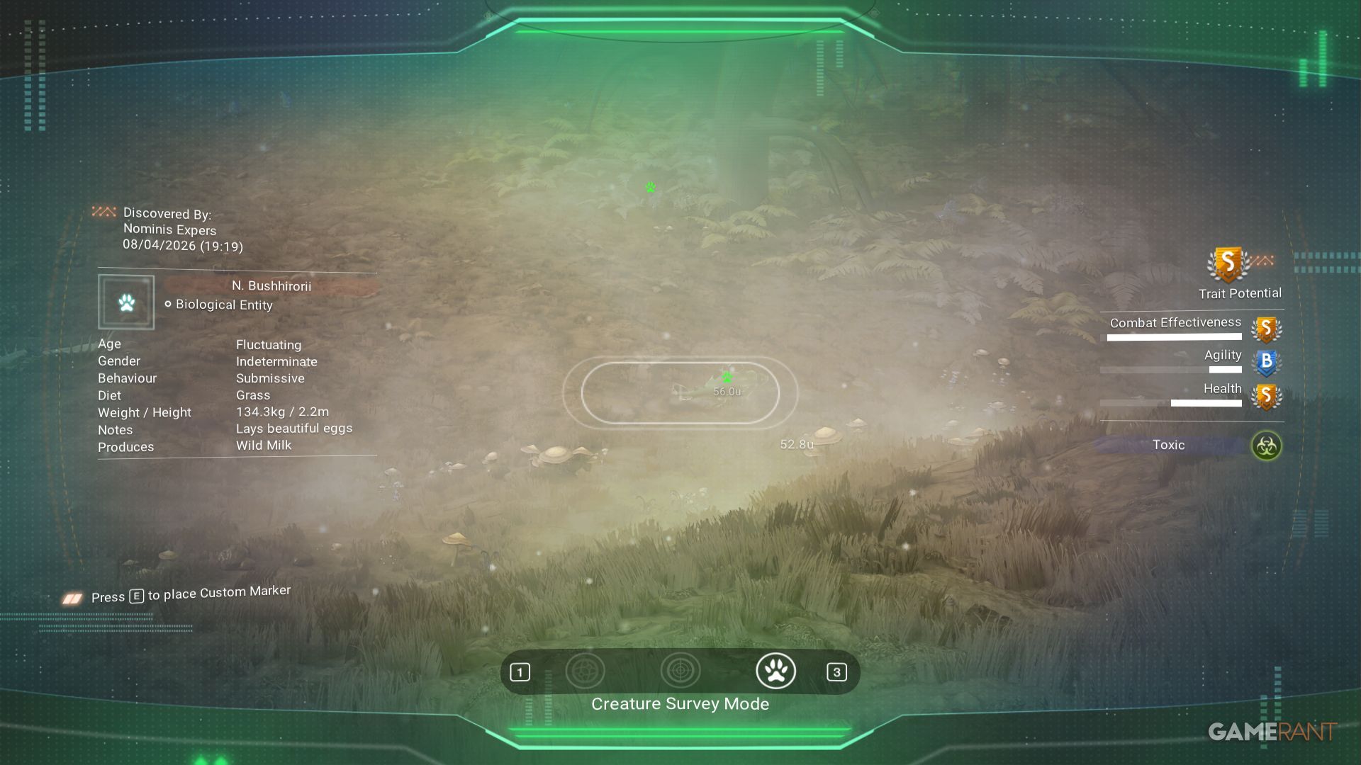 Players can change modes by pressing the ‘3’ key until they reach Creature Survey Mode, which is marked with a paw icon. This mode displays a creature’s potential stats on the right side of the screen. When choosing creatures, focus on those with high potential in Combat Effectiveness, Agility, and Health.