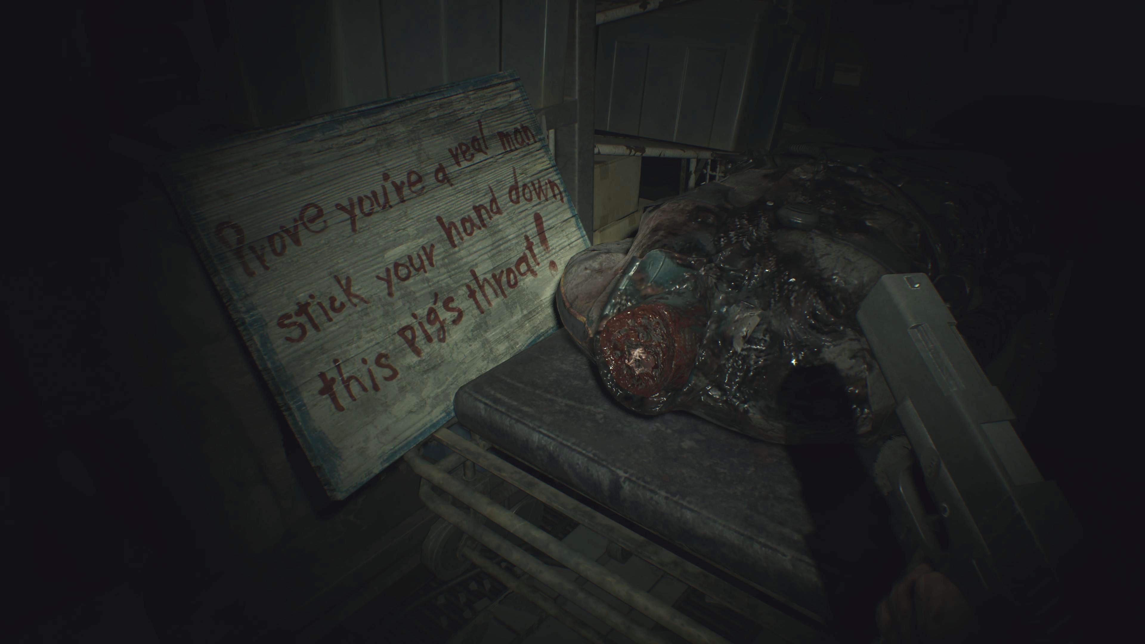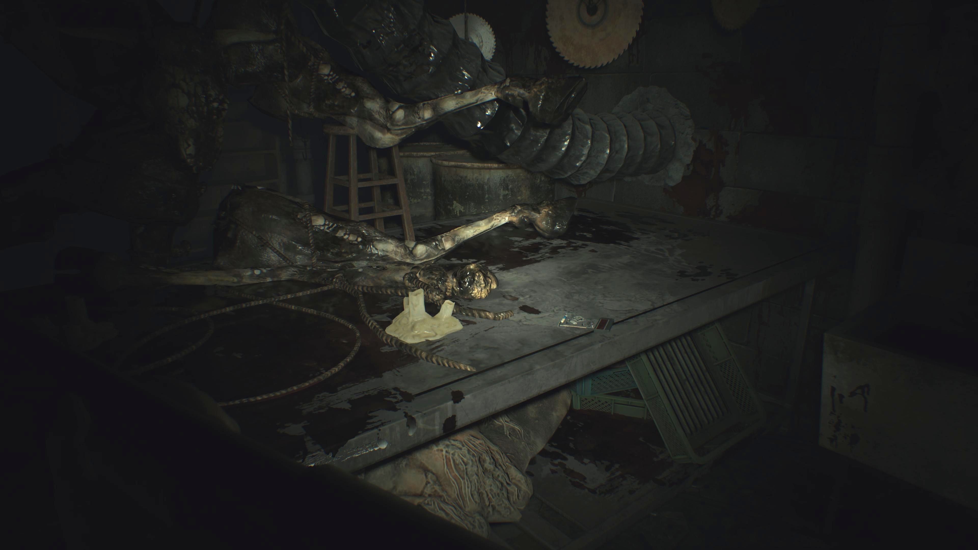 Once you’ve found the D-series arm in Eveline’s bedroom, head back to the trailer. You’ll get a call from Lucas who tells you to investigate the fridge. Inside, you’ll discover a disturbing clue that leads you to the Dissection Room – you may remember it from searching for the Red Dog Head in RE7. Be ready to fight several Molded creatures as you explore this area.