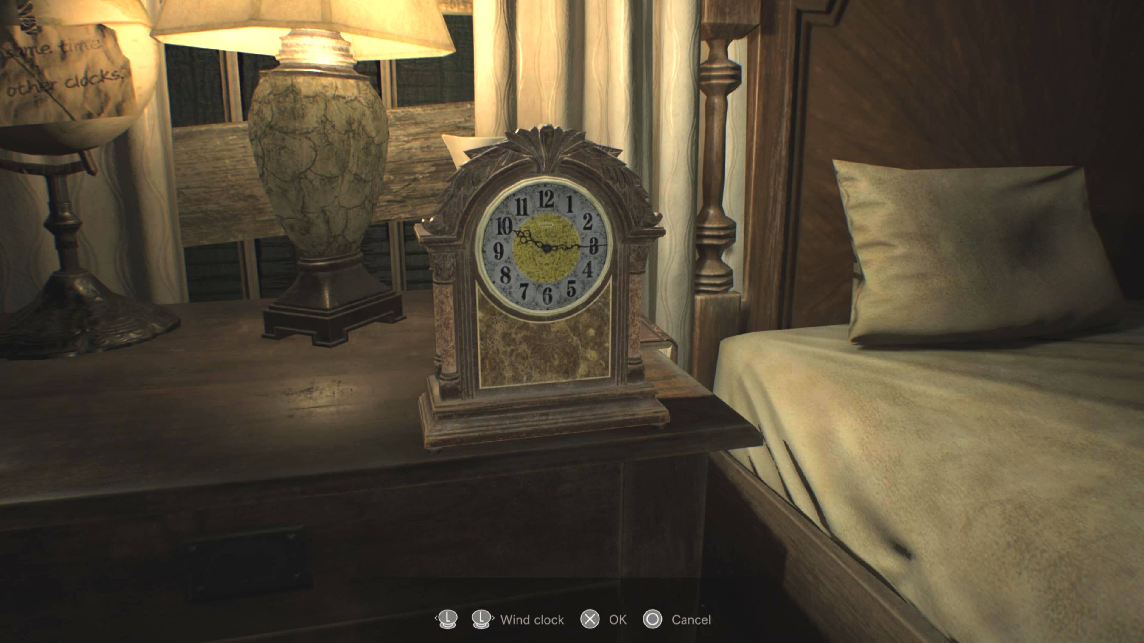 After you’ve searched this room and made sure you have space in your inventory, examine the antique clock on the bedside table. You’ll find a note attached to the nearby globe that says “same time as all other clocks.” This is a hint that the clock needs to be set to 10:15 – with the hour hand pointing at the 10 and the minute hand at the 3. You can confirm this by looking at the grandfather clock in the Main Hall.