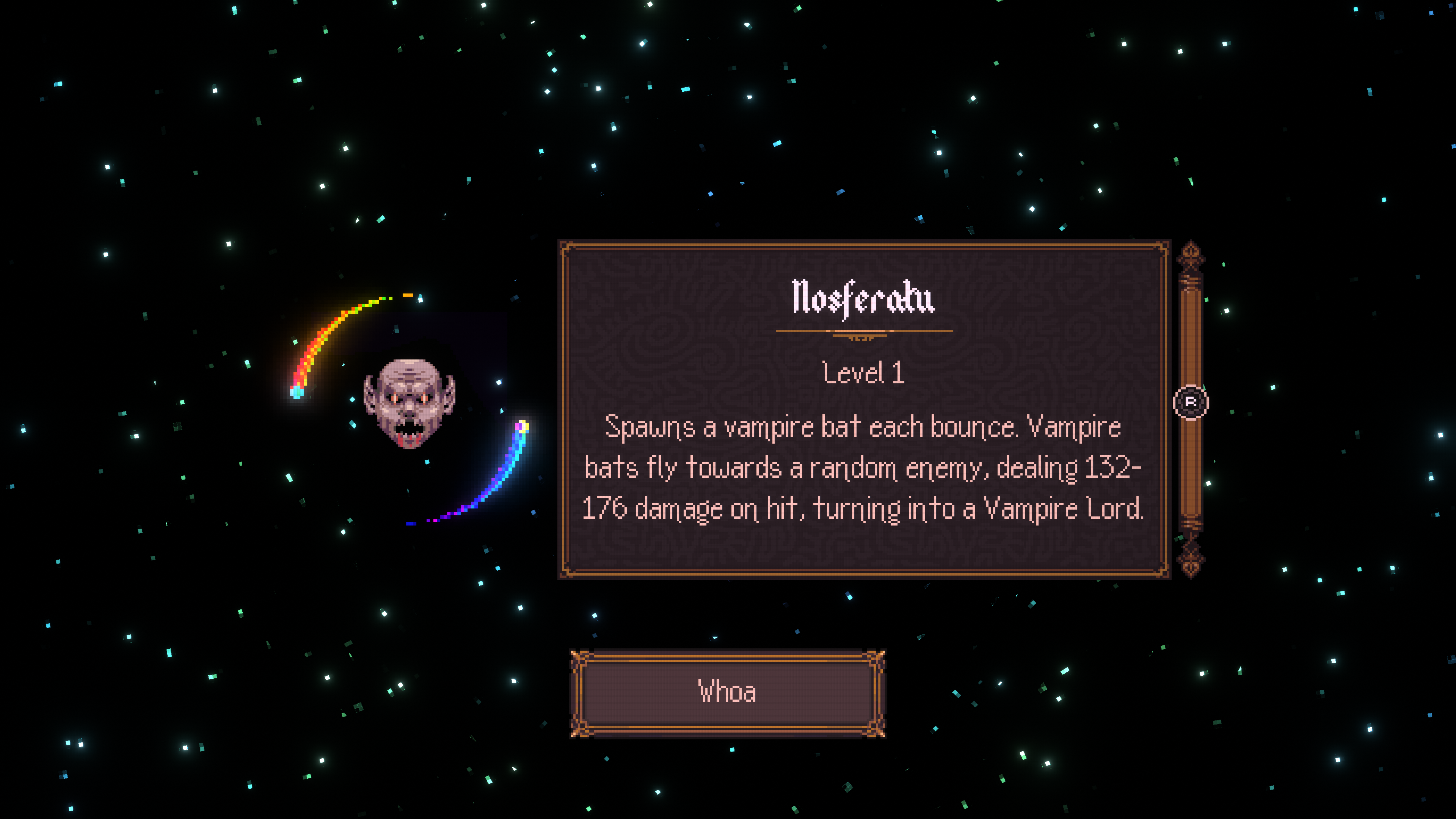 You might have noticed that the table only shows 41 Evolutions. That’s because there’s a hidden Evolution, called Ball x Pit, which you unlock by combining three others. To get Nosferatu, you’ll need to level up Mosquito King, Spider Queen, and Vampire Lord to Level 3, and then select the Evolution option.