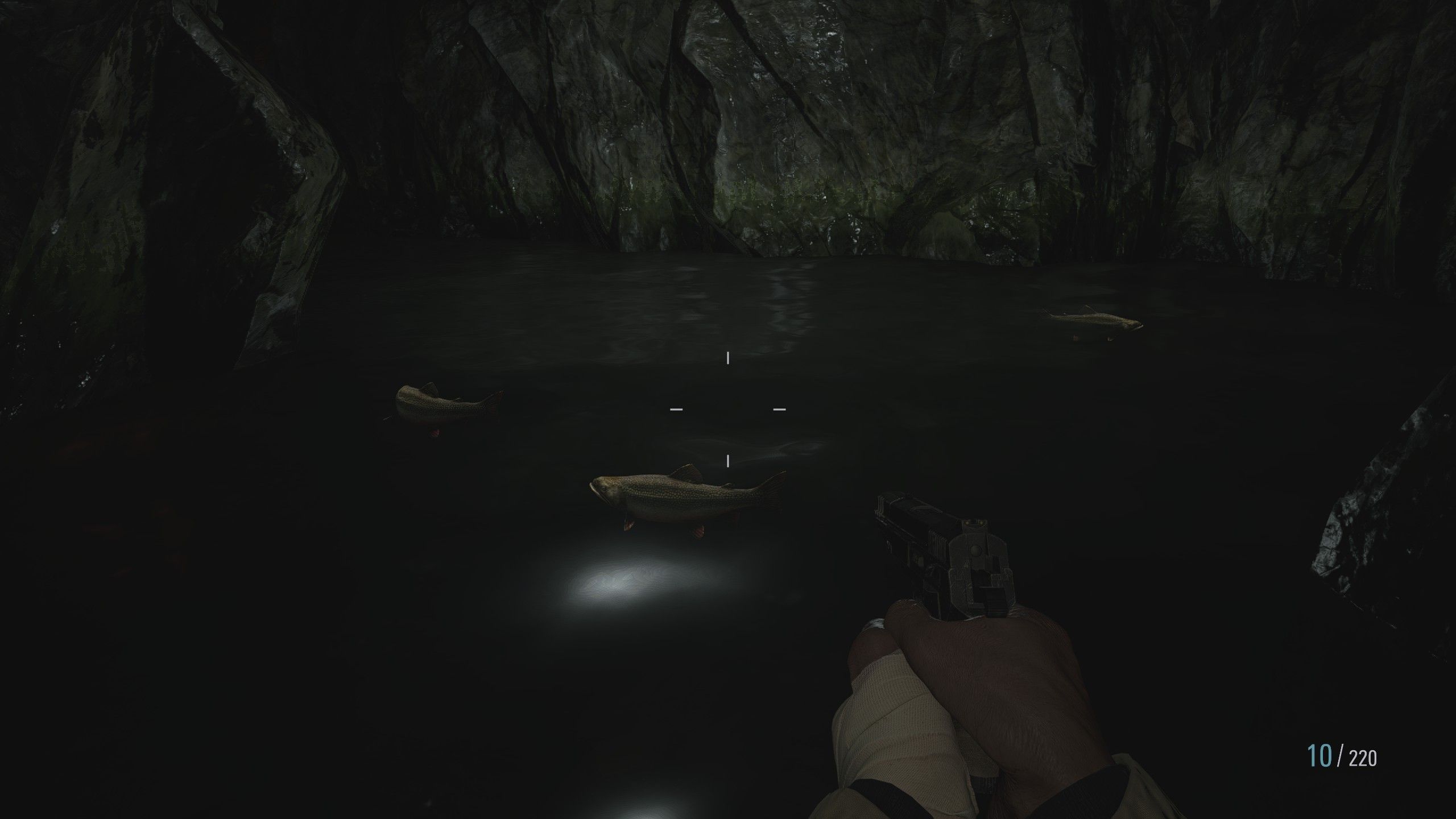 Okay, so when I was making my way through Moreau’s Reservoir, I hit this cave. It’s super important to turn right inside – don’t go straight towards the tent! If you go through the tent, a cutscene starts and you can’t go back to get anything you missed. If you do turn right, you’ll find a big pond with four fish in it.