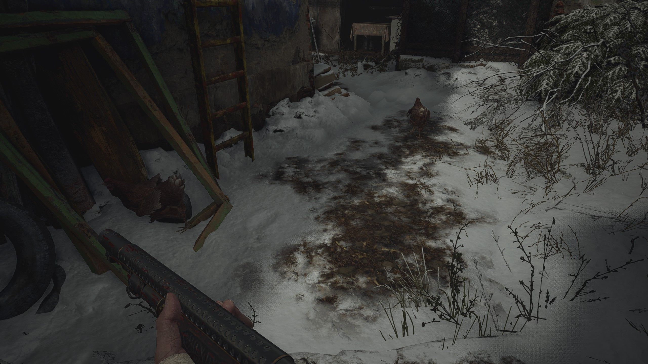 After leaving Castle Dimitrescu and returning to the Village, you can find more chickens. Go east from the Graveyard, through the overgrown field, and then south into a fenced-off area. You’ll find 2 chickens and 2 Poultry there.
