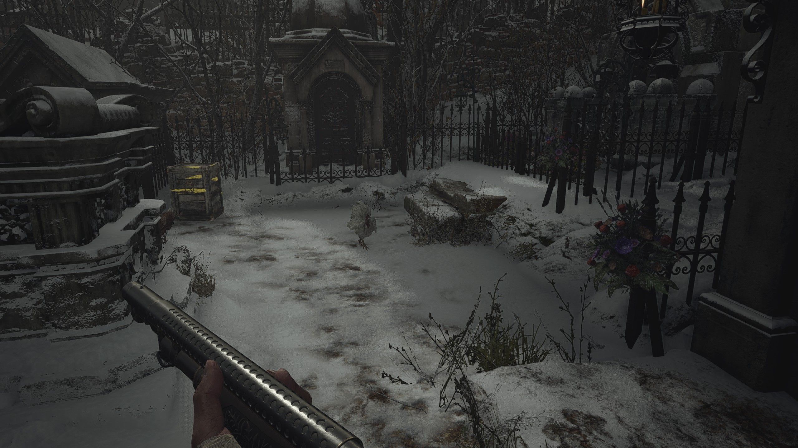 Once you’re back in the Village after visiting Castle Dimitrescu, head around to the back of the Church through the Graveyard. On the right, you’ll find a locked gate that opens with the Iron Insignia Key. Beyond the gate is a small cemetery filled with mausoleums, and you can find three chickens there, each giving you one Poultry when interacted with (for a total of three Poultry).