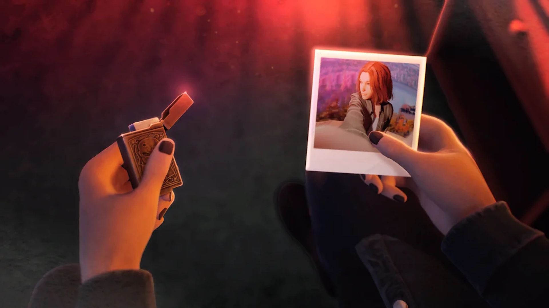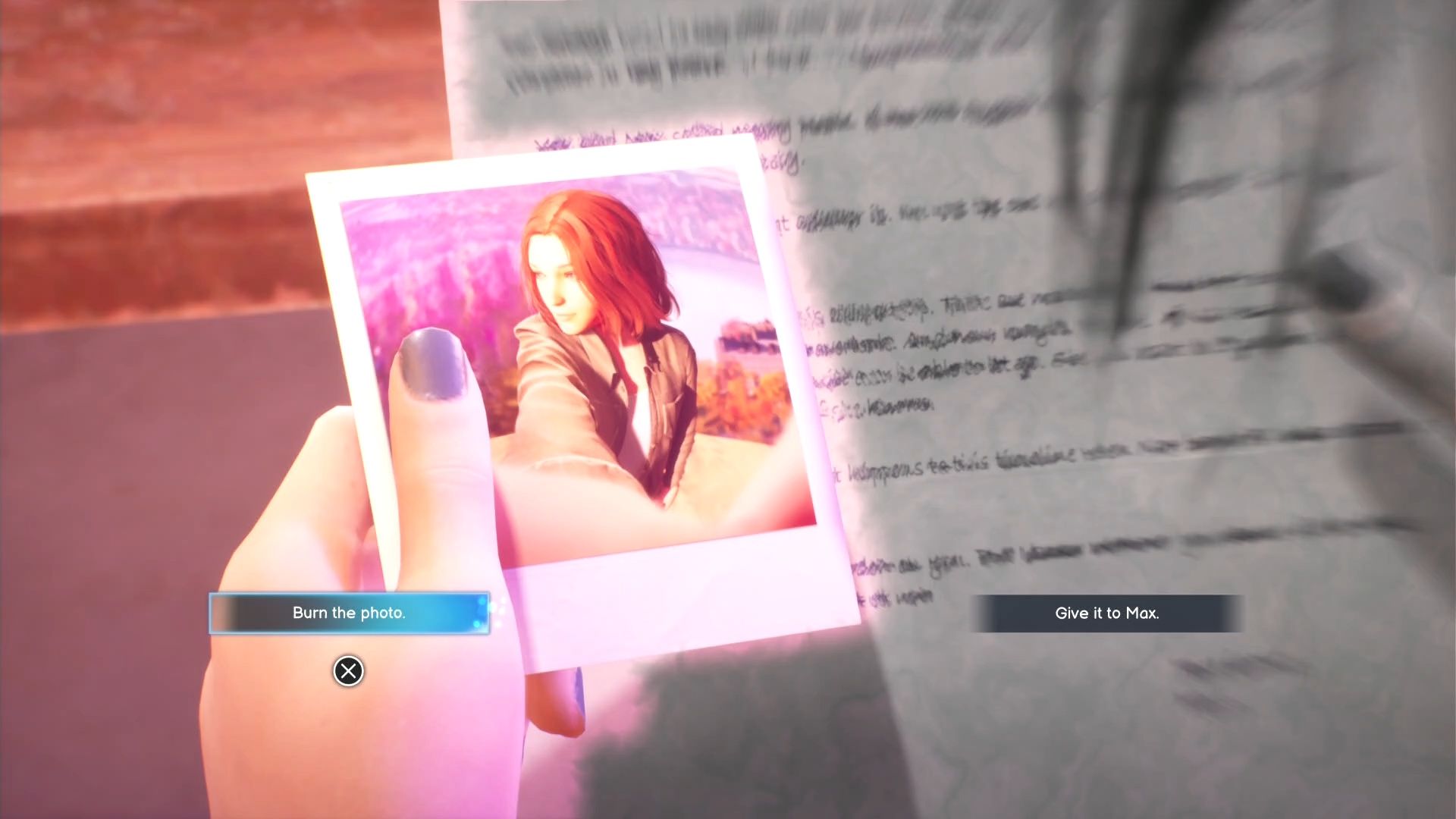 The first ending of the game shows Max and Chloe happily traveling, likely on a road trip, and a photo taken by Max is visible. The very last images depict Max holding that photo while also holding a lighter, suggesting she destroys it by burning it.