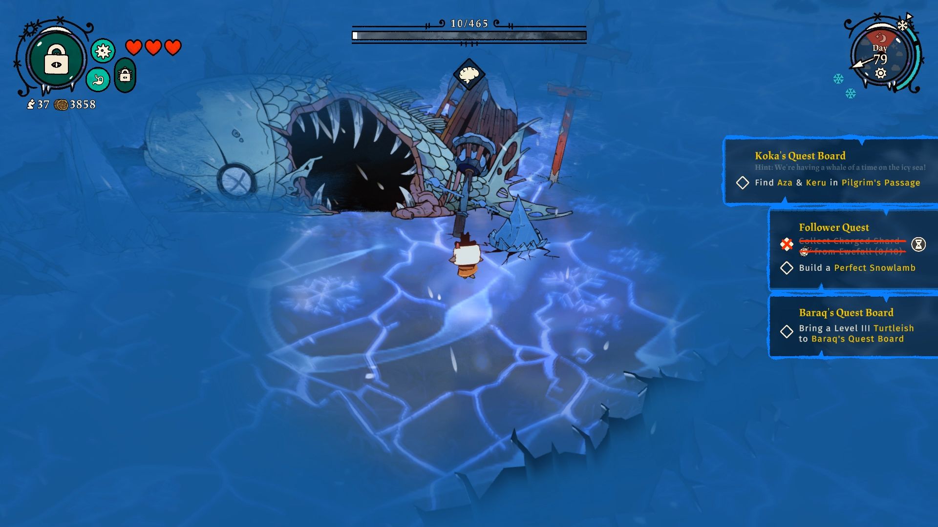Head directly towards your destination, or try to maneuver through the blizzard, and you’ll eventually find a fish with a hole in its side. Swim inside to reach the fishing spot.