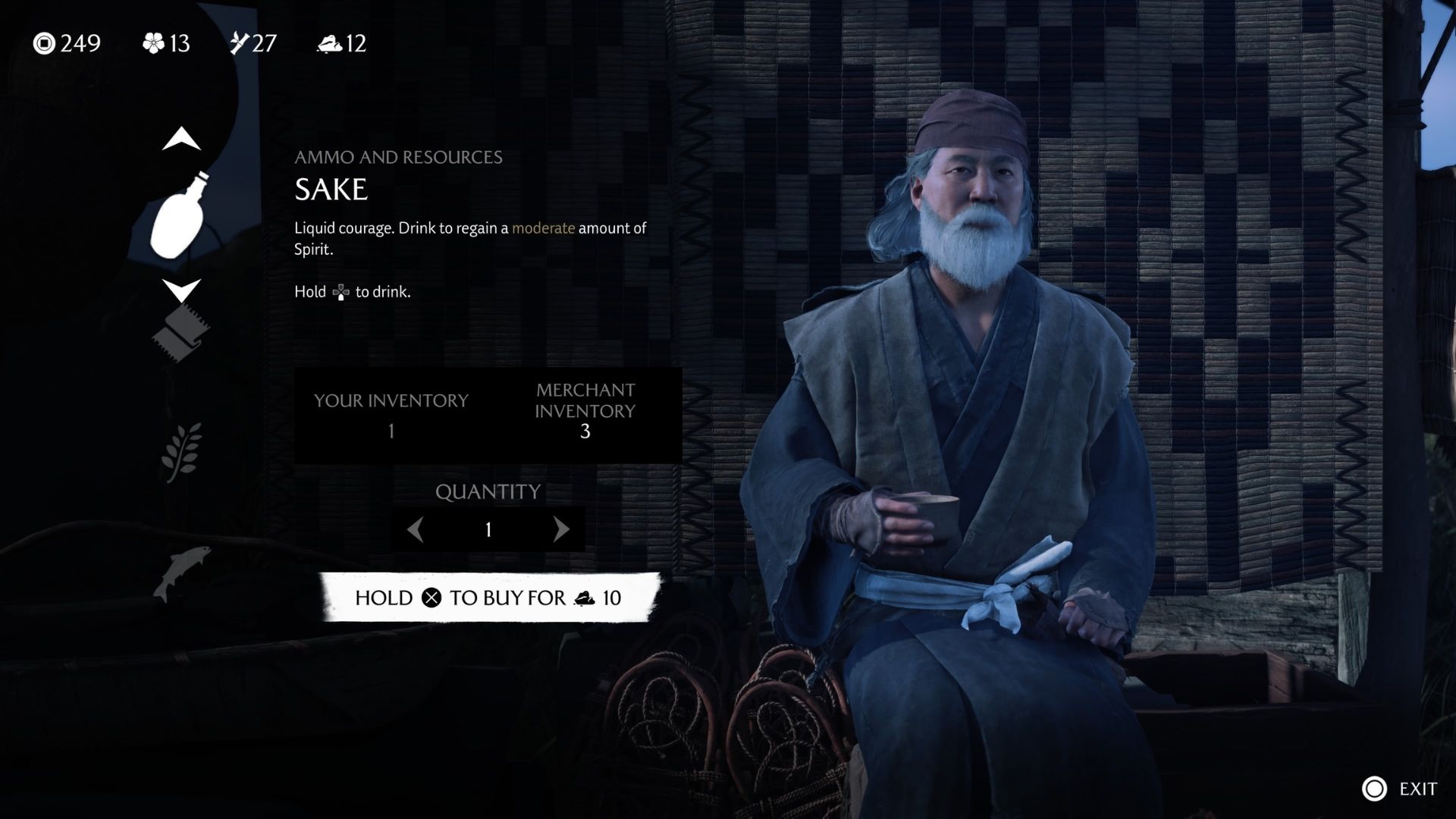 Alternatively, Atsu has the option to buy sake from merchants found in Ainu villages and large cities. Each jar of sake costs 10 copper coins, and these merchants usually have three jars available. Don’t worry if they’re out-their supply will be replenished, so you can return later for more.