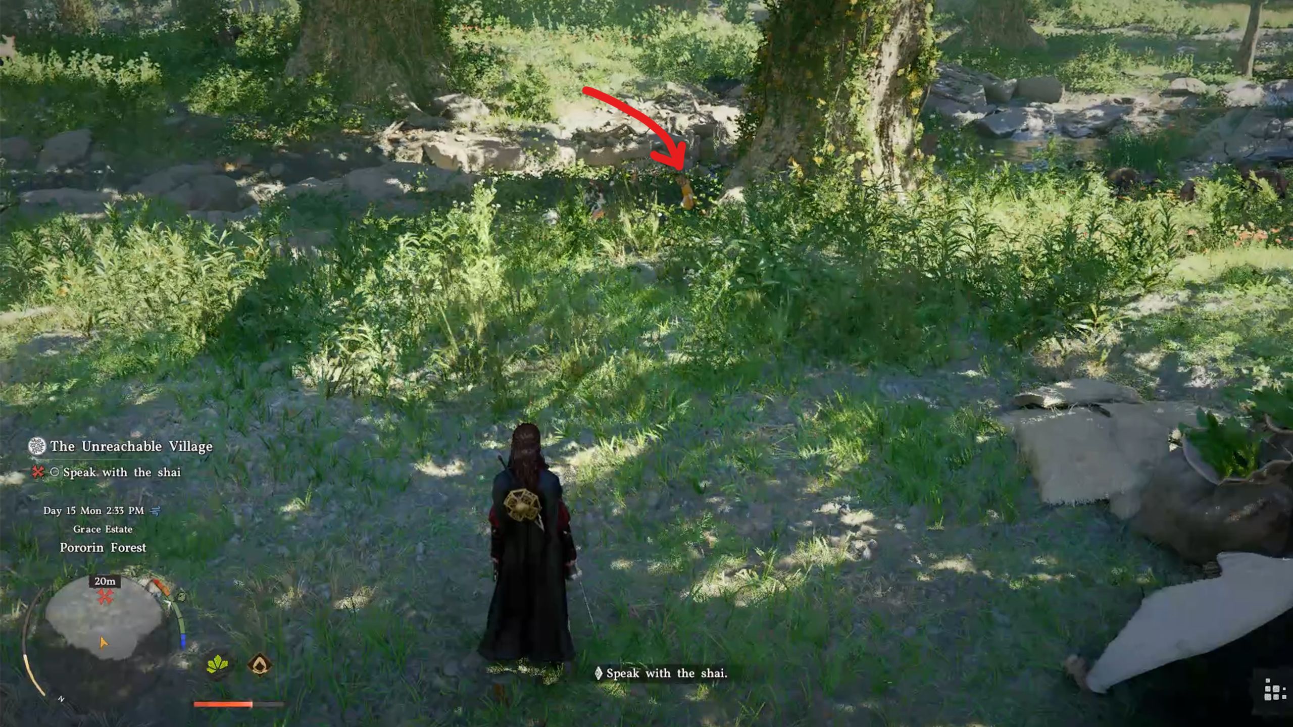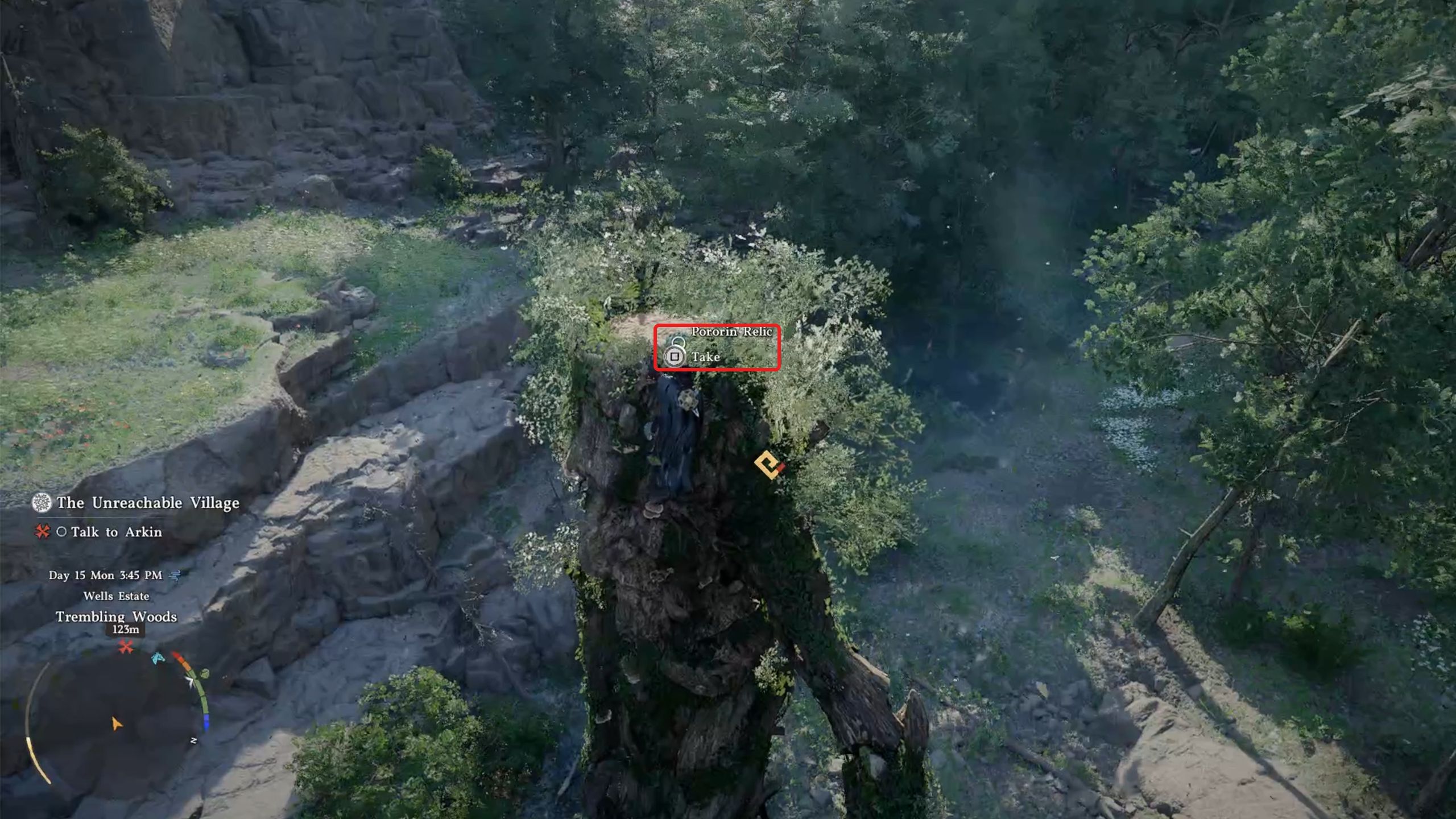 4. Follow the quest marker to reach Arkin, and he will tell you to retrieve the Relic of Pororin from a “really tall creature” that roams the Willow River.