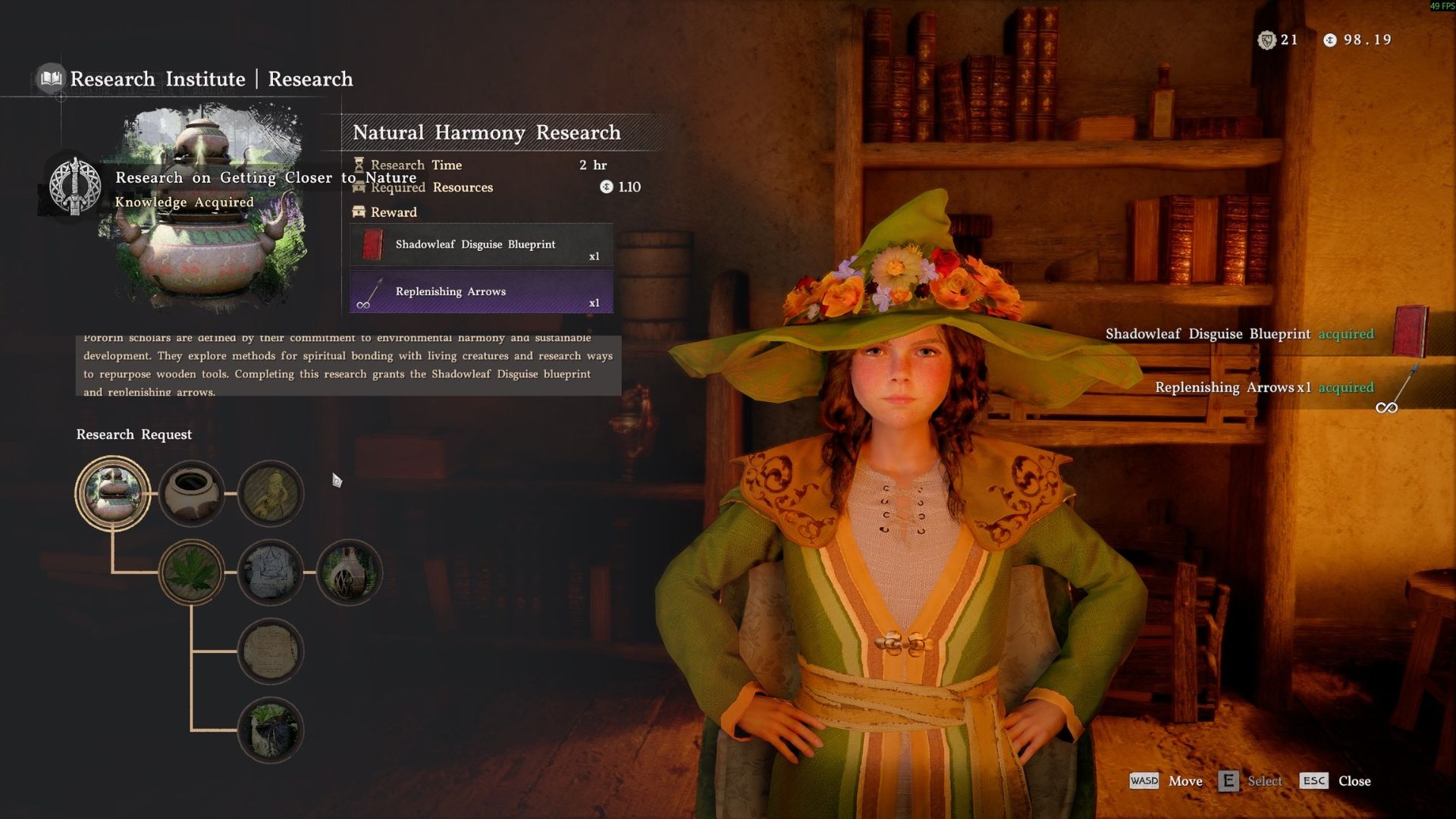 Come back to Lumiel after 2 game hours (which is about 10 real-life minutes). Then, choose “Research Completed” in the Research Request menu to get your Replenishing Arrows and the recipe for the Shadowleaf Disguise Blueprint.